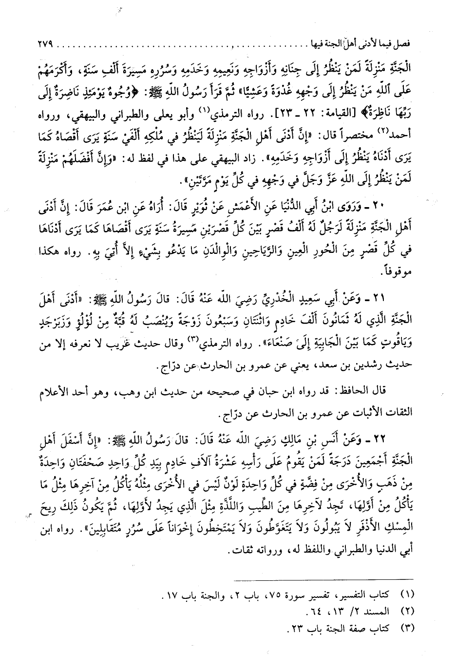 الْجنَّة منزلَة لمن ينظر إِلَى جنانه وأزواجه ونعيمه وخدمه وسرره مسيرَة ألف سنة وَأكْرمهمْ على الله من ينظر إِلَى وَجهه غدْوَة وعشيا ثمَّ قَرَأَ رَسُول الله صلى الله عَلَيْهِ وَسلم وُجُوه يَوْمئِذٍ ناضرة إِلَى رَبهَا ناظرة الْقِيَامَة 22 32
