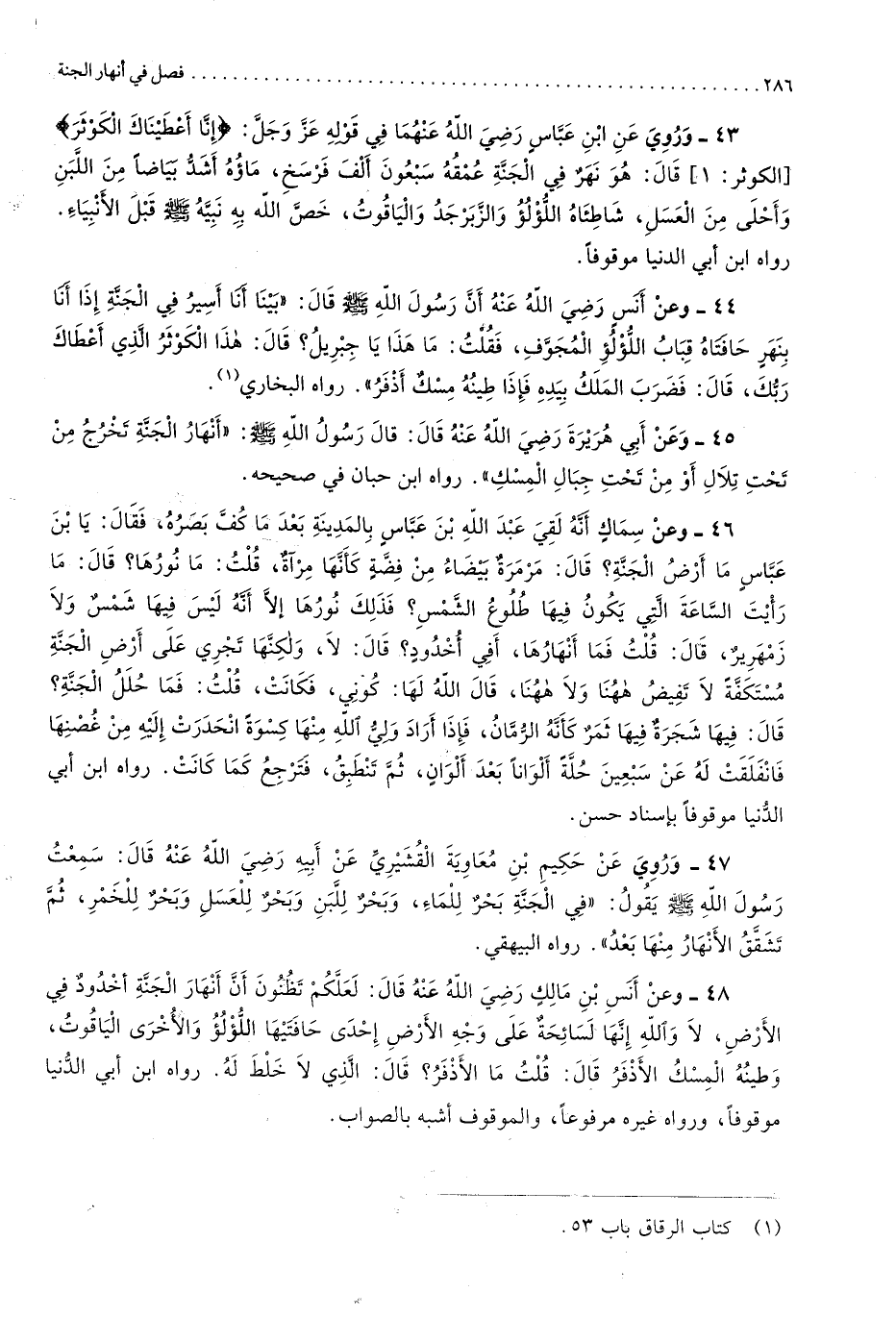 إِنَّا أعطي الْكَوْثَر الْكَوْثَر 1 قَالَ هُوَ نهر فِي الْجنَّة عمقه سَبْعُونَ ألف فَرسَخ مَاؤُهُ أَشد بَيَاضًا من اللَّبن وَأحلى من الْعَسَل شاطئاه اللُّؤْلُؤ والزبرجد والياقوت خص الله بِهِ نبيه صلى الله عَلَيْهِ وَسلم قبل الْأَنْبِيَاء