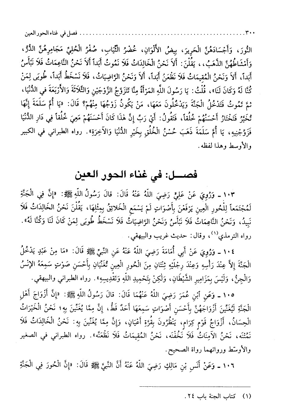 النُّور وأجسادهن الْحَرِير بيض الألوان خضر الثِّيَاب صفر الْحلِيّ مجامرهن الدّرّ وأمشاطهن الذَّهَب يقلن أَلا نَحن الخالدات فَلَا نموت أبدا أَلا نَحن الناعمات فَلَا نبأس أبدا أَلا وَنحن المقيمات فَلَا نظعن أبدا أَلا وَنحن الراضيات فَلَا نسخط أبدا طُوبَى لمن كُنَّا لَهُ وَكَانَ لنا قلت يَا رَسُول الله الْمَرْأَة منا تتَزَوَّج الزَّوْجَيْنِ وَالثَّلَاثَة وَالْأَرْبَعَة فِي الدُّنْيَا ثمَّ تَمُوت فَتدخل الْجنَّة ويدخلون مَعهَا من يكون زَوجهَا مِنْهُم قَالَ يَا أم سَلمَة إِنَّهَا تخير فتختار أحْسنهم خلقا فَتَقول أَي رب إِن هَذَا كَانَ أحْسنهم معي خلقا فِي دَار الدُّنْيَا فزوجنيه يَا أم سَلمَة ذهب حسن الْخلق بِخَير الدُّنْيَا وَالْآخِرَة