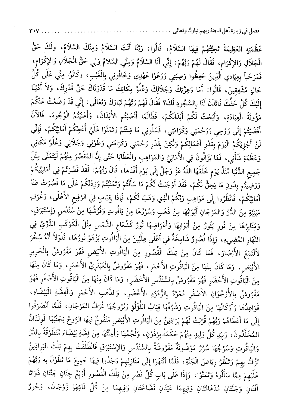 عَظمته الْعَظِيمَة تحيتهم فِيهَا السَّلَام قَالُوا رَبنَا أَنْت السَّلَام ومنك السَّلَام وَلَك حق الْجلَال وَالْإِكْرَام فَقَالَ لَهُم رَبهم إِنِّي أَنا السَّلَام ومني السَّلَام ولي حق الْجلَال وَالْإِكْرَام فمرحبا بعبادي الَّذين حفظوا وصيتي ورعوا عهدي وخافوني بِالْغَيْبِ وَكَانُوا مني على كل حَال مشفقين قَالُوا أما وَعزَّتك وجلالك وعلو مَكَانك مَا قدرناك حق قدرك وَلَا أدينا إِلَيْك كل حَقك فائذن لنا بِالسُّجُود لَك فَقَالَ لَهُم رَبهم تبَارك وَتَعَالَى إِنِّي قد وضعت عَنْكُم مؤونة الْعِبَادَة وأبحت لكم أبدانكم فطالما أنصبتم الْأَبدَان وأعنيتم الْوُجُوه فَالْآن أفضيتم إِلَى روحي ورحمتي وكرامتي فسلوني مَا شِئْتُم وتمنوا عَليّ أعطكم أمانيكم فَإِنِّي لن أجزيكم الْيَوْم بِقدر أَعمالكُم وَلَكِن بِقدر رَحْمَتي وكرامتي وطولي وَجَلَالِي وعلو مَكَاني وعظمة شأني فَمَا يزالون فِي الْأَمَانِي والمواهب والعطايا حَتَّى إِن المقصر مِنْهُم ليتمنى مثل جَمِيع الدُّنْيَا مُنْذُ يَوْم خلقهَا الله عز وَجل إِلَى يَوْم أفناها قَالَ رَبهم لقد قصرتم فِي أمانييكم ورضيتم بِدُونِ مَا يحِق لكم فقد أوجبت لكم مَا سَأَلْتُم وتمنيتم وزدتكم على مَا قصرت عَنهُ أمانيكم فانظروا إِلَى مواهب ربكُم الَّذِي وهب لكم فَإِذا بقباب فِي الرفيع الْأَعْلَى وغرف مَبْنِيَّة من الدّرّ والمرجان أَبْوَابهَا من ذهب وسررها من ياقوت وفرشها من سندس وإستبرق ومنابرها من نور يثور من أَبْوَابهَا وأعراضها نور كشعاع الشَّمْس مثل الْكَوْكَب الدُّرِّي فِي النَّهَار المضيء وَإِذا قُصُور شامخة فِي أَعلَى عليين من الْيَاقُوت يزهو نورها فلولا أَنه سخر لالتمع الْأَبْصَار فَمَا كَانَ من تِلْكَ الْقُصُور من الْيَاقُوت الْأَبْيَض فَهُوَ مفروش بالحرير الْأَبْيَض وَمَا كَانَ مِنْهَا من الْيَاقُوت الْأَحْمَر فَهُوَ مفروش بالعبقري الْأَحْمَر وَمَا كَانَ مِنْهَا من الْيَاقُوت الْأَخْضَر فَهُوَ مفروش بالسندس الْأَخْضَر وَمَا كَانَ مِنْهَا من الْيَاقُوت الْأَصْفَر فَهُوَ مفروش بالأرجوان الْأَصْفَر مموه بالزمرد الْأَخْضَر وَالذَّهَب الْأَحْمَر وَالْفِضَّة الْبَيْضَاء قواعدها وأركانها من الْيَاقُوت وشرفها قباب اللُّؤْلُؤ وبروجها غرف المرجان فَلَمَّا انصرفوا إِلَى مَا أَعْطَاهُم رَبهم قربت لَهُم براذين من الْيَاقُوت الْأَبْيَض منفوخ فِيهَا الرّوح يجنبها الْولدَان المخلدون وبيد كل وليد مِنْهُم حِكْمَة برذون ولجمها وأعنتها من فضَّة بَيْضَاء متطوقة بالدر والياقوت وسرجها سرر موضونة مفروشة بالسندس والإستبرق فَانْطَلَقت بهم تِلْكَ البراذين تزف بهم وَتنظر رياض الْجنَّة فَلَمَّا انْتَهوا إِلَى مَنَازِلهمْ وجدوا فِيهَا جَمِيع مَا تطول بِهِ رَبهم عَلَيْهِم مِمَّا سَأَلُوهُ وتمنوا وَإِذا على بَاب كل قصر من تِلْكَ الْقُصُور أَربع جنان جنتان ذواتا أفنان وجنتان مدهامتان وَفِيهِمَا عينان نضاختان وَفِيهِمَا من كل فَاكِهَة زوجان وحور