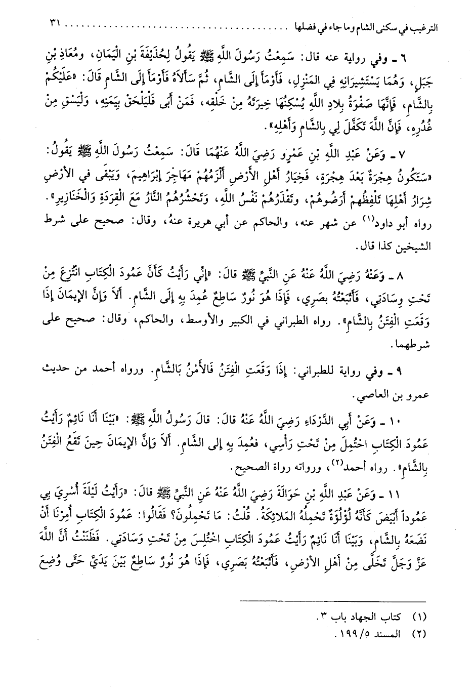 4673 - وَعنهُ رَضِي الله عَنهُ عَن النَّبِي صلى الله عَلَيْهِ وَسلم قَالَ إِنِّي رَأَيْت كَأَن عَمُود الْكتاب انتزع من تَحت وِسَادَتِي فَأَتْبَعته بَصرِي فَإِذا هُوَ نور سَاطِع عمد بِهِ إِلَى الشَّام