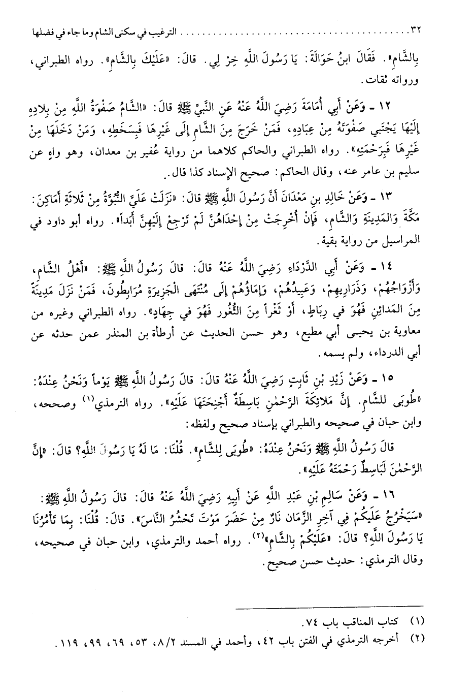 رَوَاهُ التِّرْمِذِيّ وَصَححهُ وَابْن حبَان فِي صَحِيحه وَالطَّبَرَانِيّ بِإِسْنَاد صَحِيح وَلَفظه قَالَ رَسُول الله صلى الله عَلَيْهِ وَسلم وَنحن عِنْده طُوبَى للشام