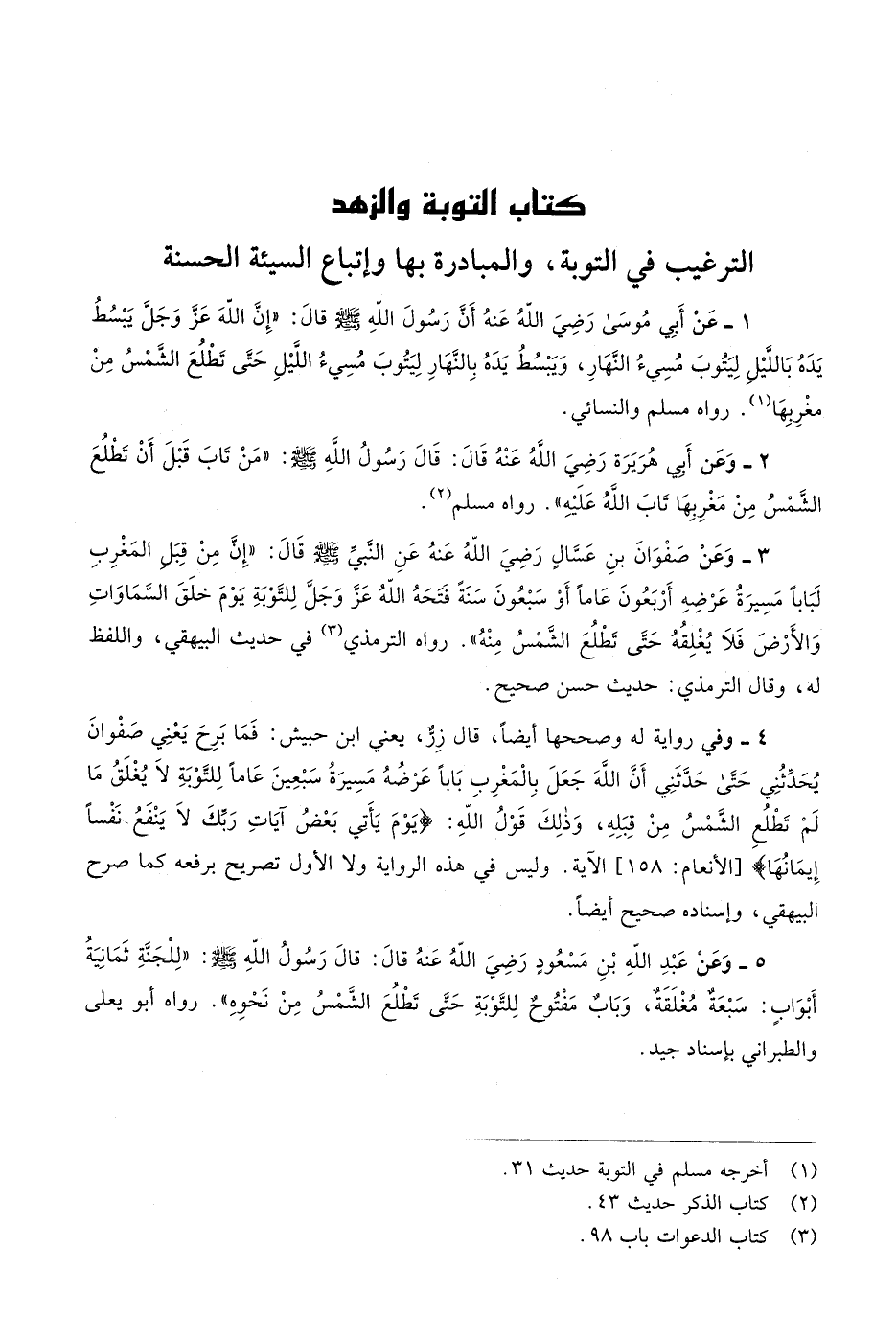 4743 - وَفِي رِوَايَة لَهُ وصححها أَيْضا قَالَ زر يَعْنِي ابْن حُبَيْش فَمَا برح يَعْنِي صَفْوَان يحدثني حَتَّى حَدثنِي أَن الله جعل بالمغرب بَابا عرضه مسيرَة سبعين عَاما للتَّوْبَة لَا يغلق مَا لم تطلع الشَّمْس من قبله وَذَلِكَ قَول الله يَوْم يَأْتِي بعض آيَات رَبك لَا ينفع نفسا إيمَانهَا الْأَنْعَام 851 الْآيَة