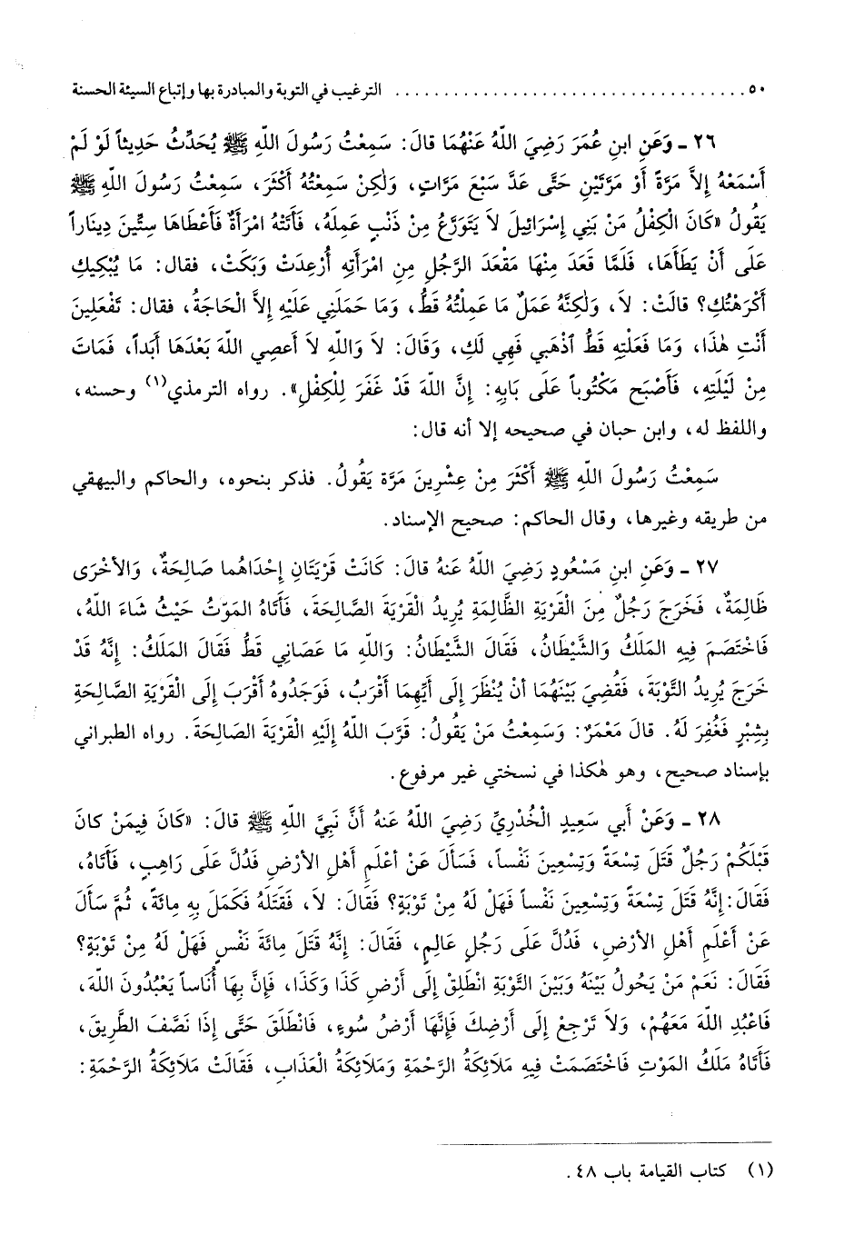 4765 - وَعَن ابْن عمر رَضِي الله عَنْهُمَا قَالَ سَمِعت رَسُول الله صلى الله عَلَيْهِ وَسلم يحدث حَدِيثا لَو لم أسمعهُ إِلَّا مرّة أَو مرَّتَيْنِ حَتَّى عد سبع مَرَّات وَلَكِن سمعته أَكثر سَمِعت رَسُول الله صلى الله عَلَيْهِ وَسلم يَقُول كَانَ الكفل من بني إِسْرَائِيل لَا يتورع من ذَنْب عمله فَأَتَتْهُ امْرَأَة فَأَعْطَاهَا سِتِّينَ دِينَارا على أَن يَطَأهَا فَلَمَّا قعد مِنْهَا مقْعد الرجل من امْرَأَته أرعدت وبكت فَقَالَ مَا يبكيك أكرهتك قَالَت لَا وَلكنه عمل مَا عملته قطّ وَمَا حَملَنِي عَلَيْهِ إِلَّا الْحَاجة فَقَالَ تفعلين أَنْت هَذَا وَمَا فعلته قطّ اذهبي فَهِيَ لَك وَقَالَ لَا وَالله لَا أعصي الله بعْدهَا أبدا فَمَاتَ من ليلته فَأصْبح مَكْتُوبًا على بَابه إِن الله قد غفر للكفل