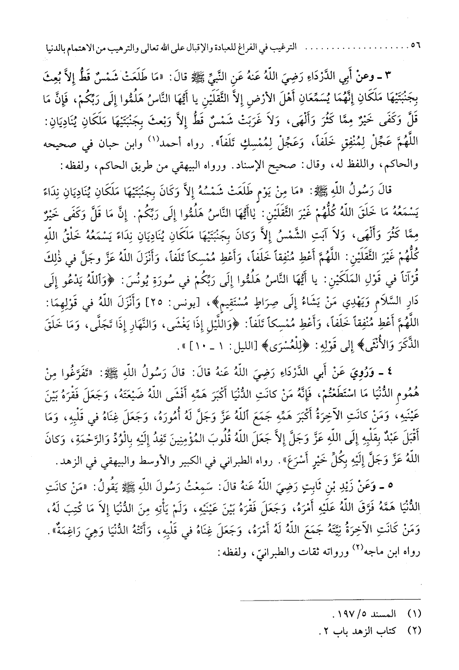 إِن مَا قل وَكفى خير مِمَّا كثر وألهى وَلَا آبت الشَّمْس إِلَّا وَكَانَ بجنبتيها ملكان يناديان نِدَاء يسمعهُ خلق الله كلهم غير الثقلَيْن اللَّهُمَّ أعْط منفقا خلفا وَأعْطِ ممسكا تلفا وَأنزل الله عز وَجل فِي ذَلِك قُرْآنًا فِي قَول الْملكَيْنِ يَا أَيهَا النَّاس هلموا إِلَى ربكُم فِي سُورَة يُونُس وَالله يَدْعُو إِلَى دَار السَّلَام وَيهْدِي من يَشَاء إِلَى صِرَاط مُسْتَقِيم يُونُس 52 وَأنزل الله فِي قَوْلهمَا اللَّهُمَّ أعْط منفقا خلفا وَأعْطِ ممسكا تلفا وَاللَّيْل إِذا يغشى وَالنَّهَار إِذا تجلى وَمَا خلق الذّكر وَالْأُنْثَى إِلَى قَوْله للعسرى اللَّيْل 1 01