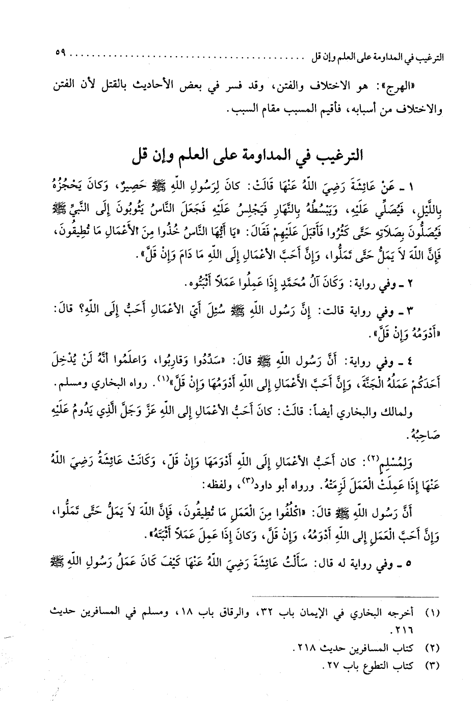 التَّرْغِيب فِي المداومة على الْعلم وَإِن قل