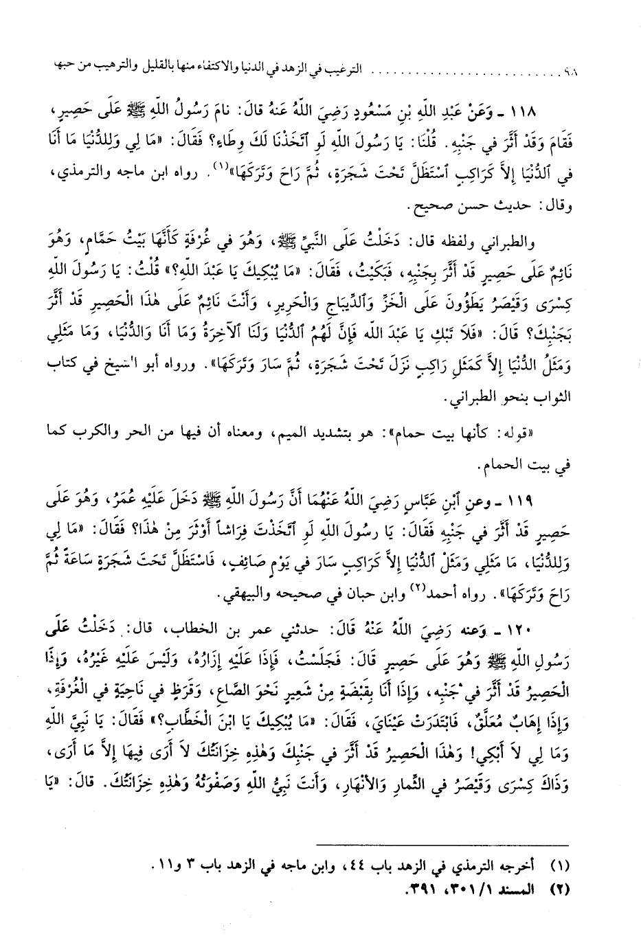 قُلْنَا يَا رَسُول الله لَو اتخذنا لَك وطاء فَقَالَ مَا لي وللدنيا مَا أَنا فِي الدُّنْيَا إِلَّا كراكب استظل تَحت شَجَرَة ثمَّ رَاح وَتركهَا