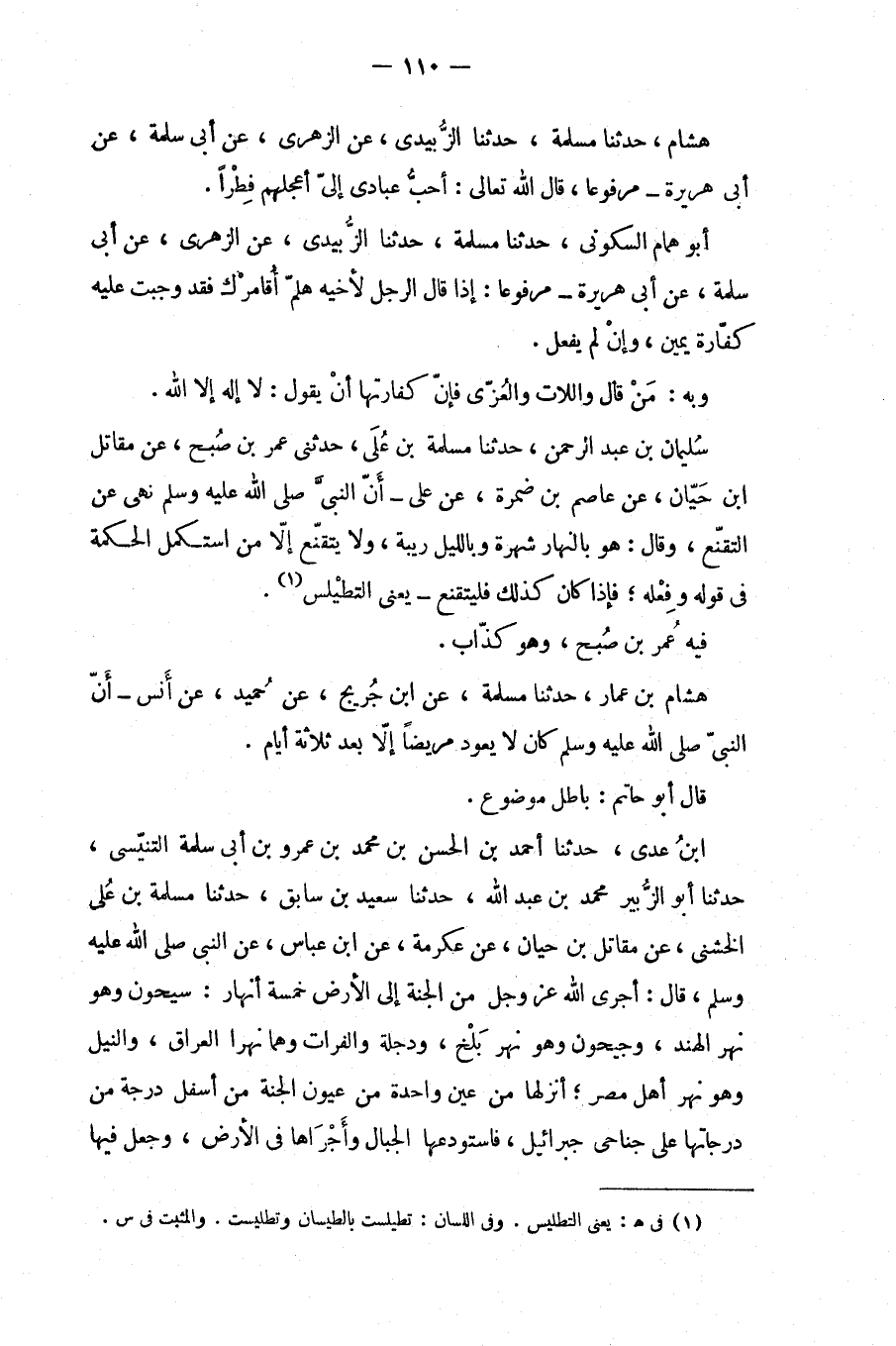 سليمان بن عبد الرحمن، حدثنا مسلمة بن علي، حدثني عمر بن صبح، عن مقاتل ابن حيان، عن عاصم بن ضمرة، عن علي - أن النبي صلى الله عليه وسلم نهى عن التقنع، وقال: هو بالنهار شهرة وبالليل ريبة، ولا يتقنع إلا من استكمل الحكمة في قوله وفعله: قإذا كان كذلك فليتقنع - يعنى التطيلس (1) .