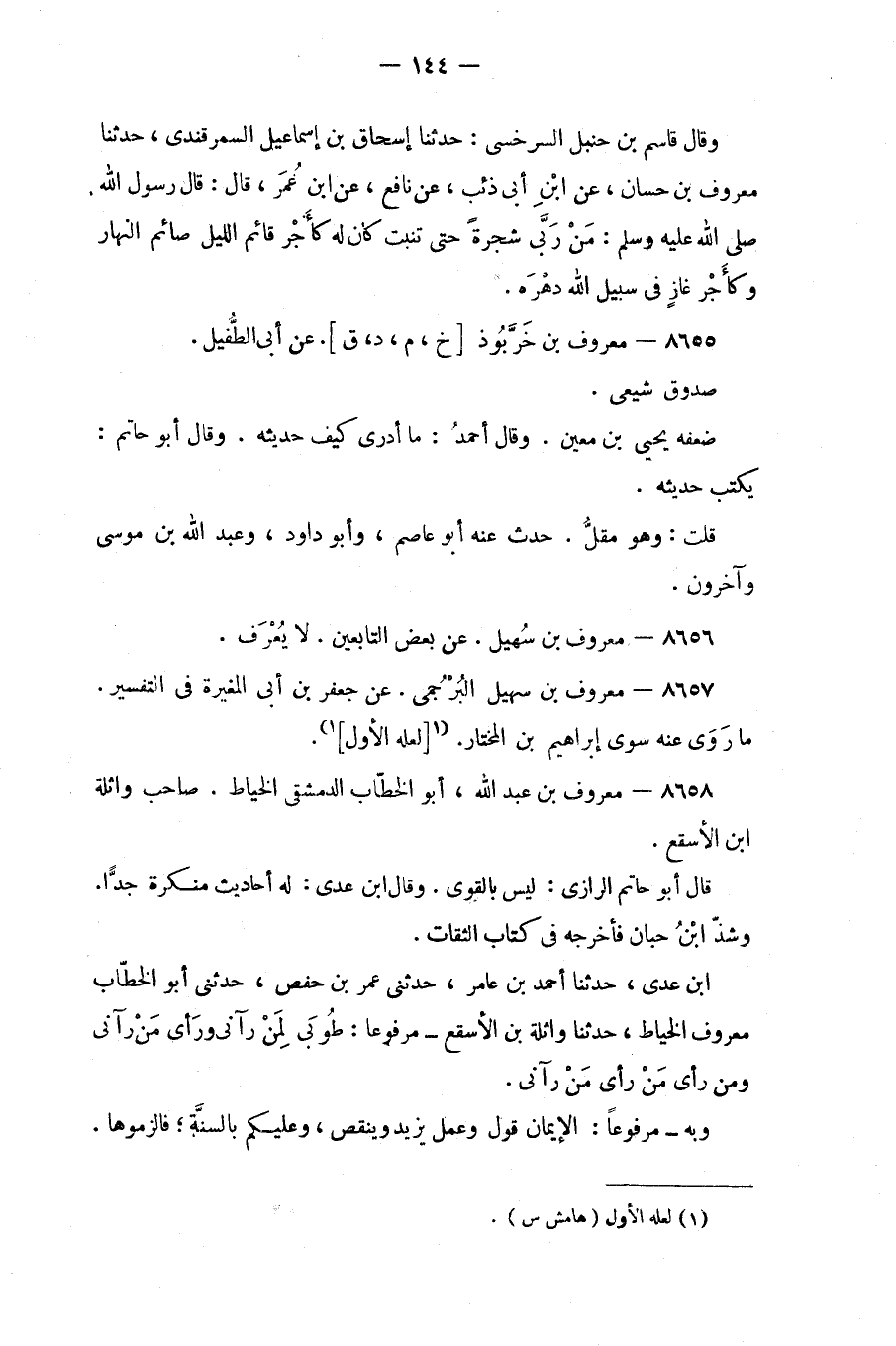 ابن عدي، حدثنا أحمد بن عامر، حدثني عمر بن حفص، حدثني أبو الخطاب معروف الخياط، حدثنا واثلة بن الأسقع - مرفوعاً: طوبى لمن رأني ورأى من رأني ومن رأى من رأى من رأني.