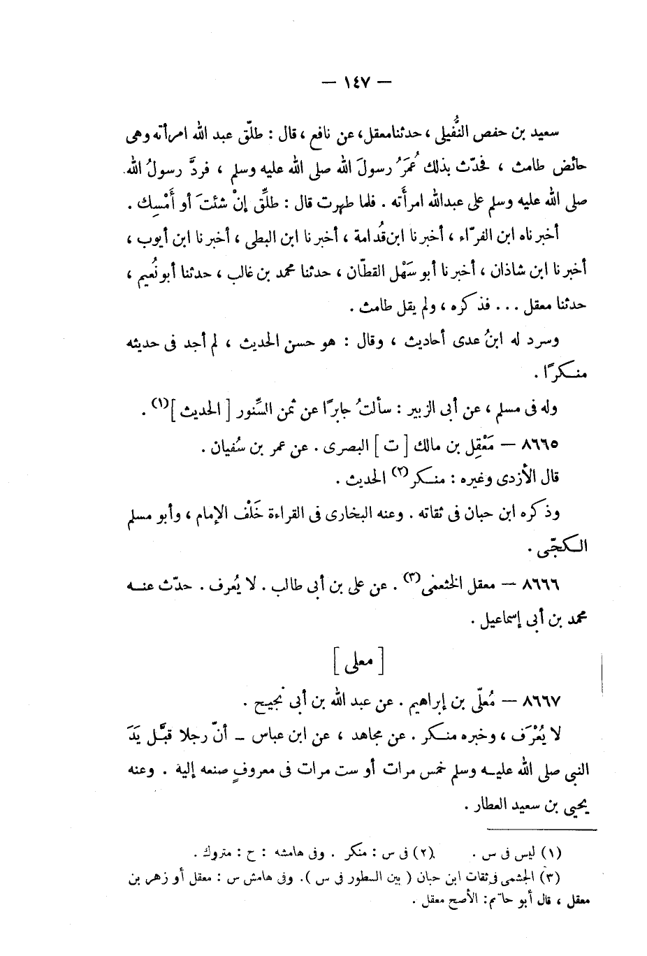سعيد بن حفص النفيلى، حدثنا معقل، عن نافع، قال: طلق عبد الله امرأته وهى حائض طامث، فحدث بذلك عمر رسول الله صلى الله عليه وسلم، فرد رسول الله صلى الله عليه وسلم على عبد الله امرأته.