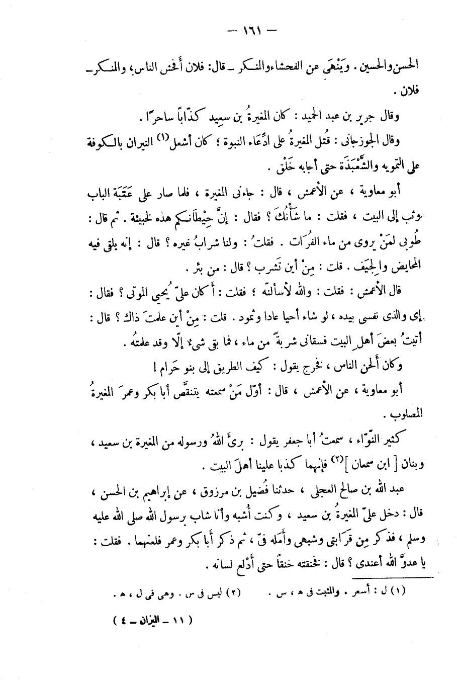 وقال الجوزجاني: قتل المغيرة على ادعاء النبوة، كان أشعل (1) النيران بالكوفة على التمويه والشعبذة حتى أجابه خلق.