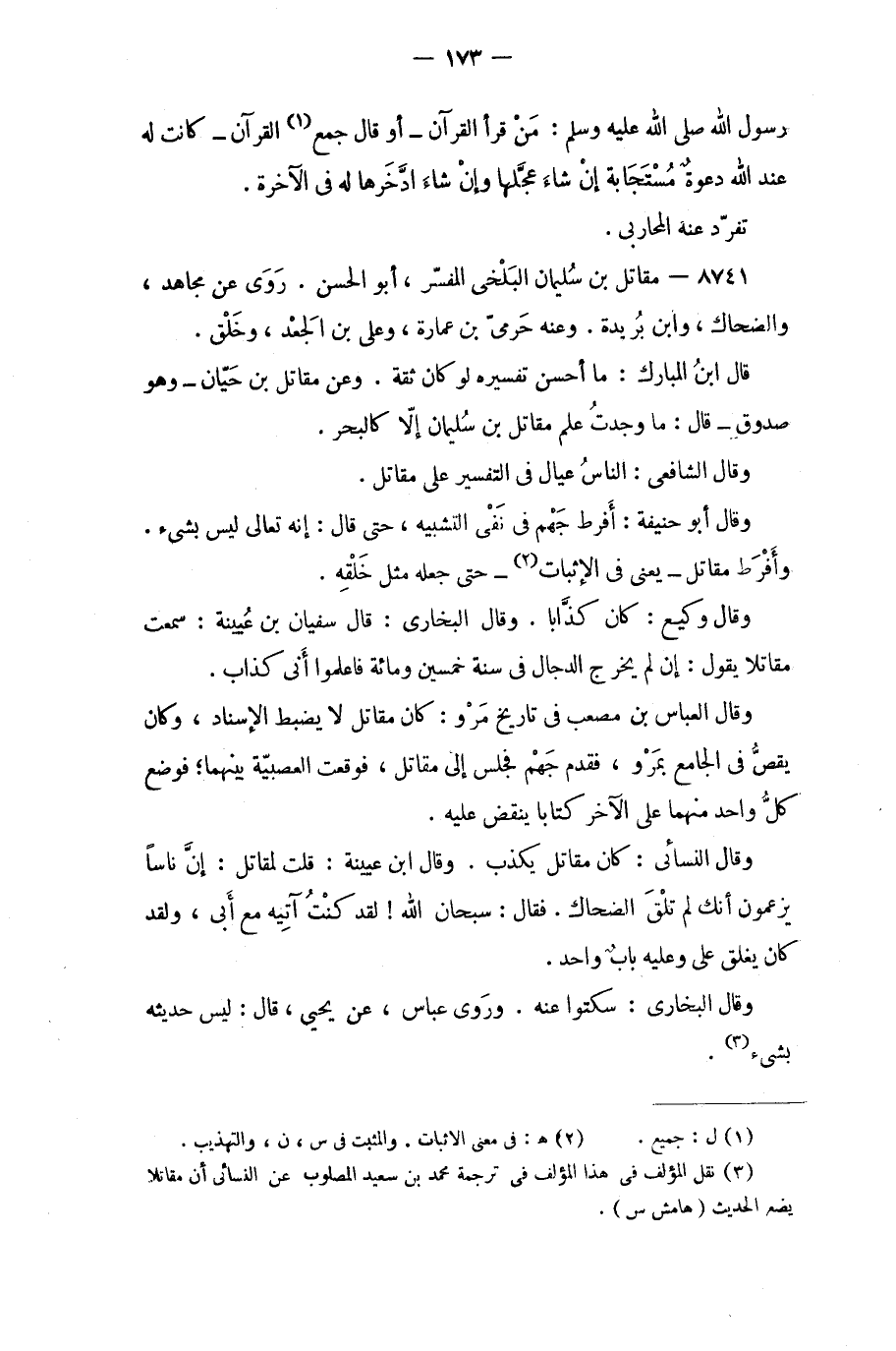 (3) نقل المؤلف في هذا المؤلف في ترجمة محمد بن سعيد المصلوب عن النسائي أن مقاتلا يضع الحديث (هامش س) .
