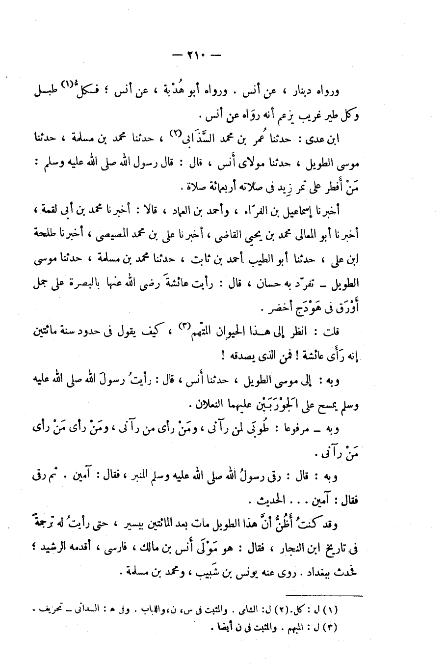 وقد كنت أظن أن هذا الطويل مات بعد المائتين بيسير، حتى رأيت له ترجمة في تار يخ ابن النجار، فقال: هو مولى أنس بن مالك، فارسي، أقدمه الرشيد،