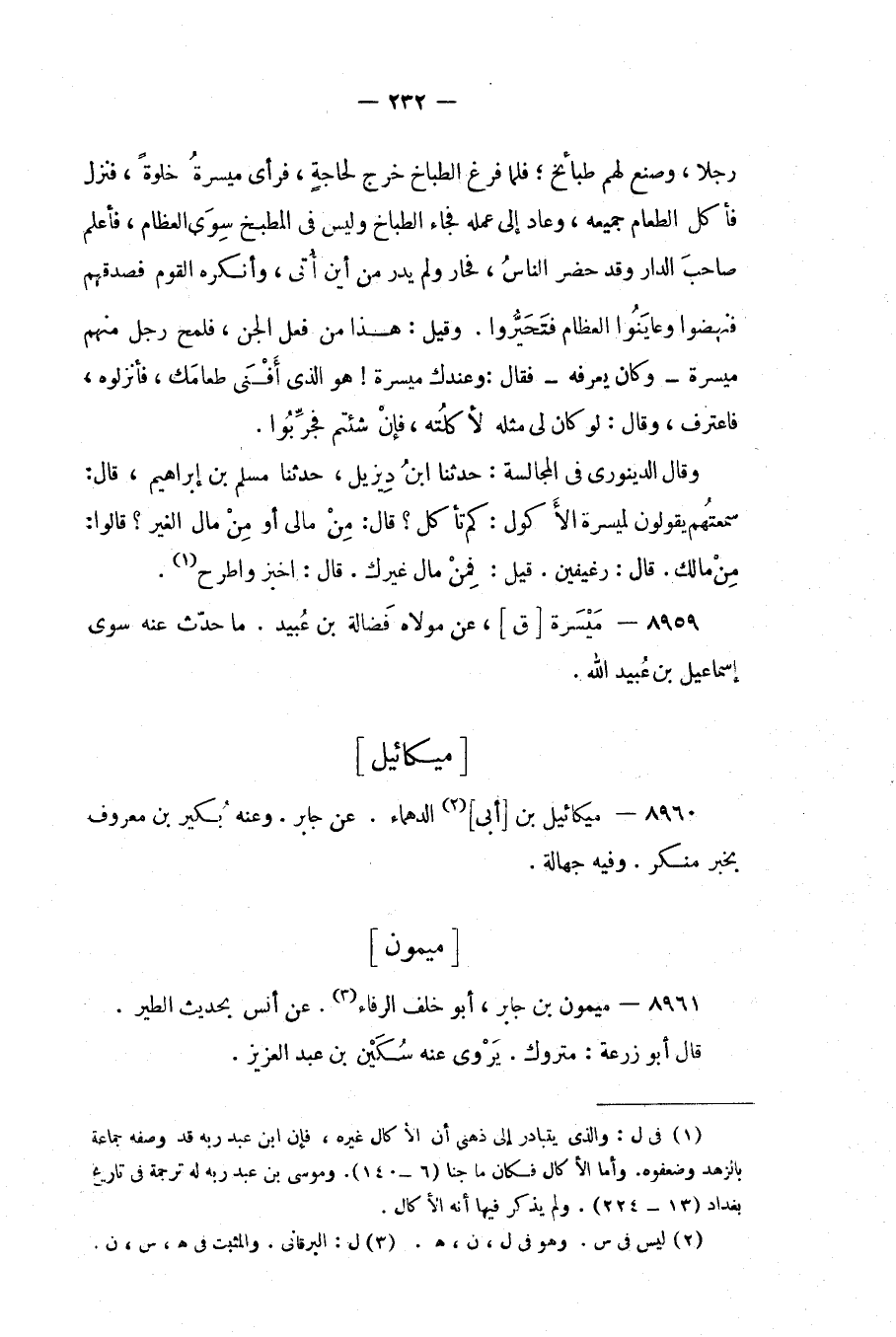 وقال الدينورى في المجالسة: حدثنا ابن ديزيل، حدثنا مسلم بن إبراهيم، قال: سمعتهم يقولون لميسرة الاكول: كم تأكل؟ قال: من مالى أو من مال الغير؟ قالوا: من مالك.