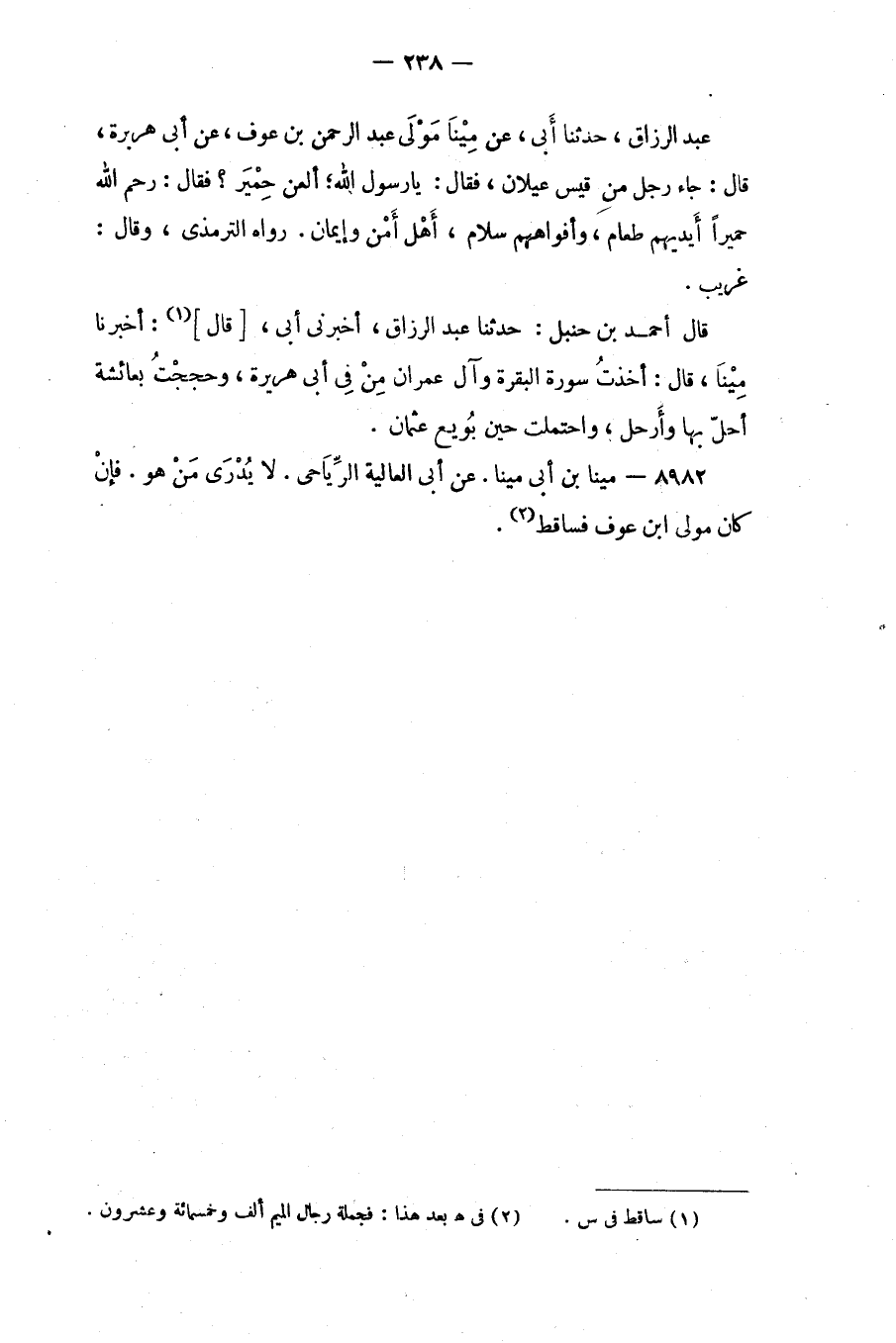 قال أحمد بن حنبل: حدثنا عبد الرزاق، أخبرني أبي، [قال] (1) : أخبرنا مينا، قال: أخذت سورة البقرة وآل عمران من في أبي هريرة، وحججت بعائشة أحل بها وأرحل، واحتملت حين بويع عثمان.