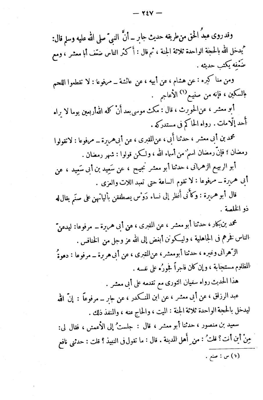 وقد روى عبد الحق من طريقه حديث جابر - أن النبي صلى الله عليه وسلم قال: يدخل الله بالحجة الواحدة ثلاثة الجنة، ثم قال: أكثر الناس ضعف أبا معشر، ومع ضعفه يكتب حديثه.