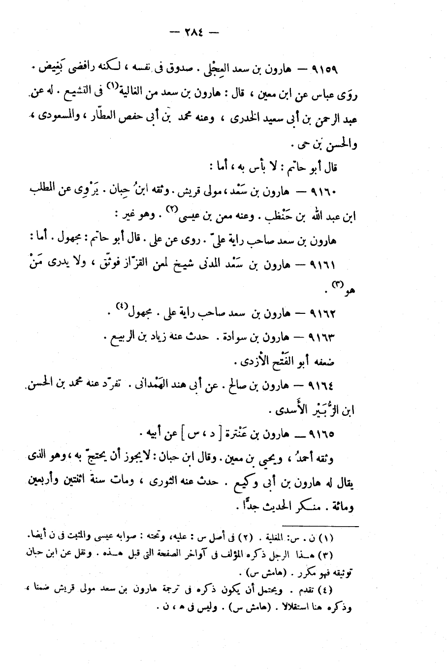 قال أبو حاتم: لا بأس به، أما: 9160 - هارون بن سعد، مولى قريش.