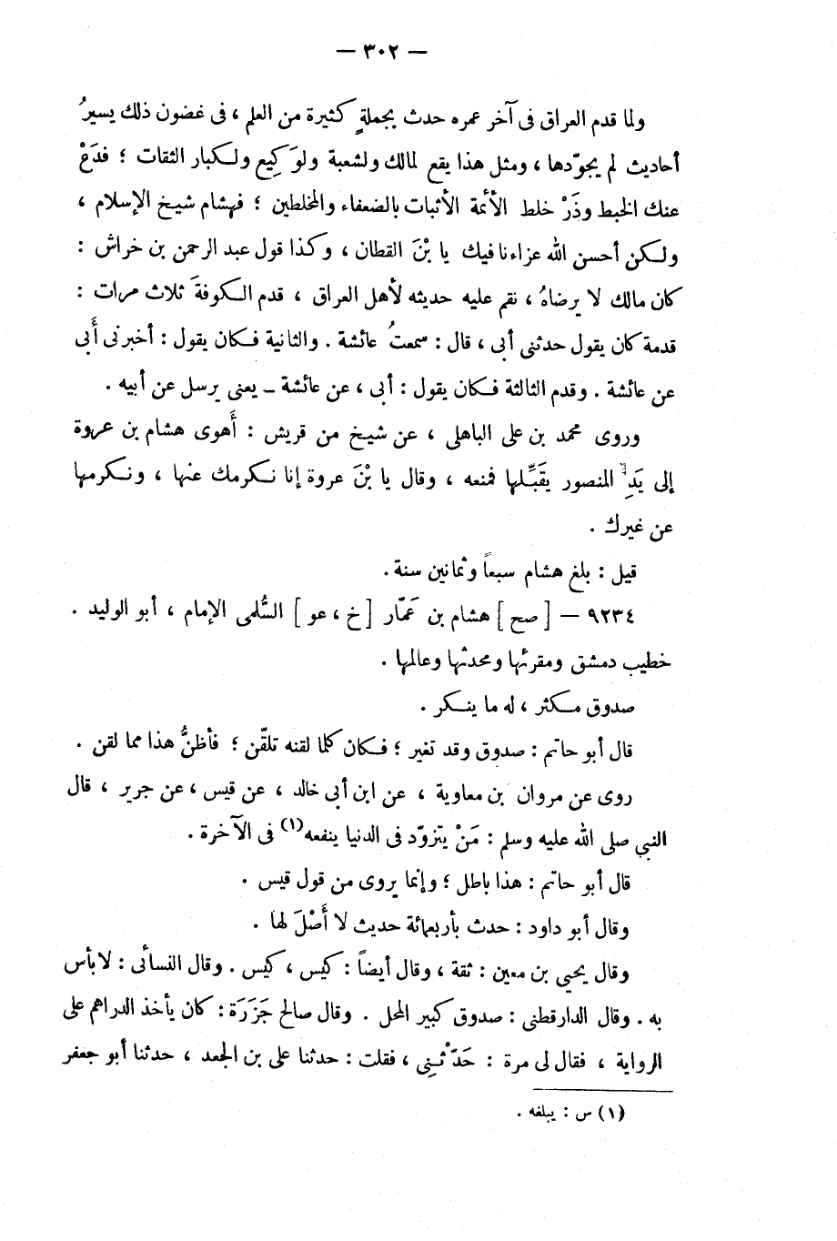 ولما قدم العراق في آخر عمره حدث بجملة كثيرة من العلم، في غضون ذلك يسير أحاديث لم يجودها، ومثل هذا يقع لمالك ولشعبة ولوكيع ولكبار الثقات، فدع عنك الخبط وذر خلط الائمة الاثبات بالضعفاء والمخلطين، فهشام شيخ الإسلام، ولكن أحسن الله عزاء نافيك يا بن القطان، وكذا قول عبد الرحمن بن خراش: كان مالك لا يرضاه، نقم عليه حديثه لاهل العراق، قدم الكوفة ثلاث مرات: قدمة كان يقول حدثني أبي، قال: سمعت عائشة.