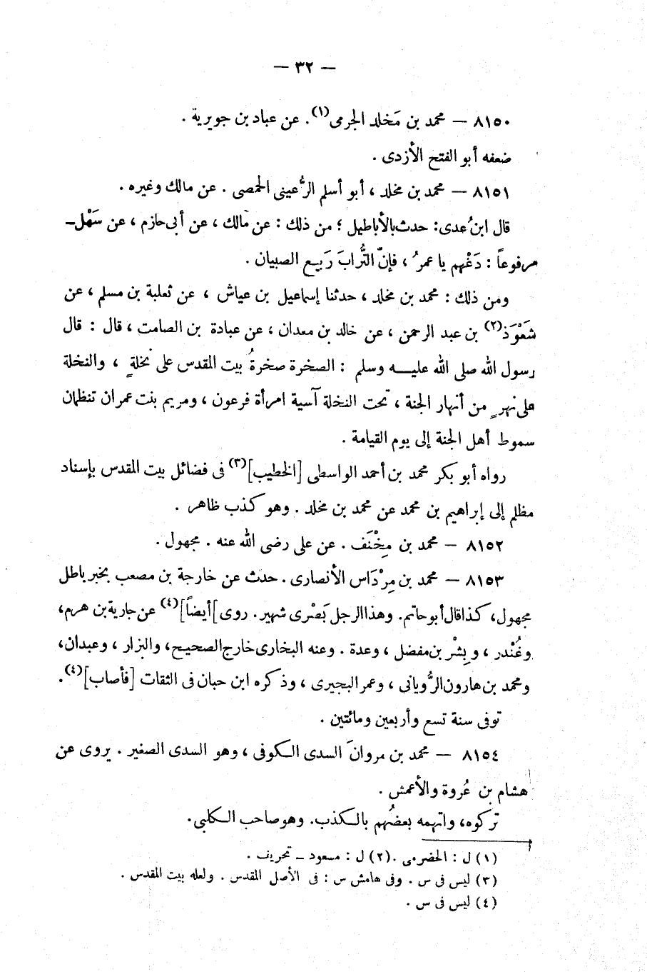 ومن ذلك: محمد بن مخلد، حدثنا إسماعيل بن عياش، عن ثعلبة بن مسلم، عن شعوذ (2) بن عبد الرحمن، عن خالد بن معدان، عن عبادة بن الصامت، قال: قال رسول الله صلى الله عليه وسلم: الصخرة صخرة بيت المقدس على نخلة، والنخلة على نهر من أنهار الجنة، تحت النخلة آسية امرأة فرعون، ومريم بنت عمران تنظمان سموط أهل الجنة إلى يوم القيامة.