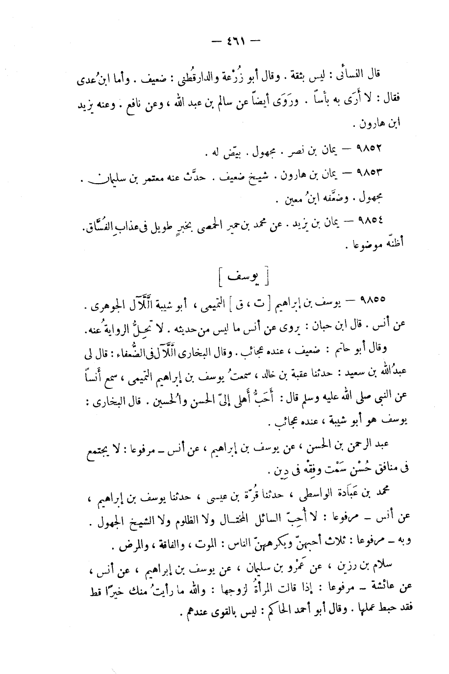 وقال أبو حاتم: ضعيف، عنده عجائب، قال البخاري اللآل في الضعفاء: قال لى عبد الله بن سعيد: حدثنا عقبة بن خالد، سمعت يوسف بن إبراهيم التميمي، سمع أنسا عن النبي صلى الله عليه وسلم قال: أحب أهلى إلى الحسن والحسين.