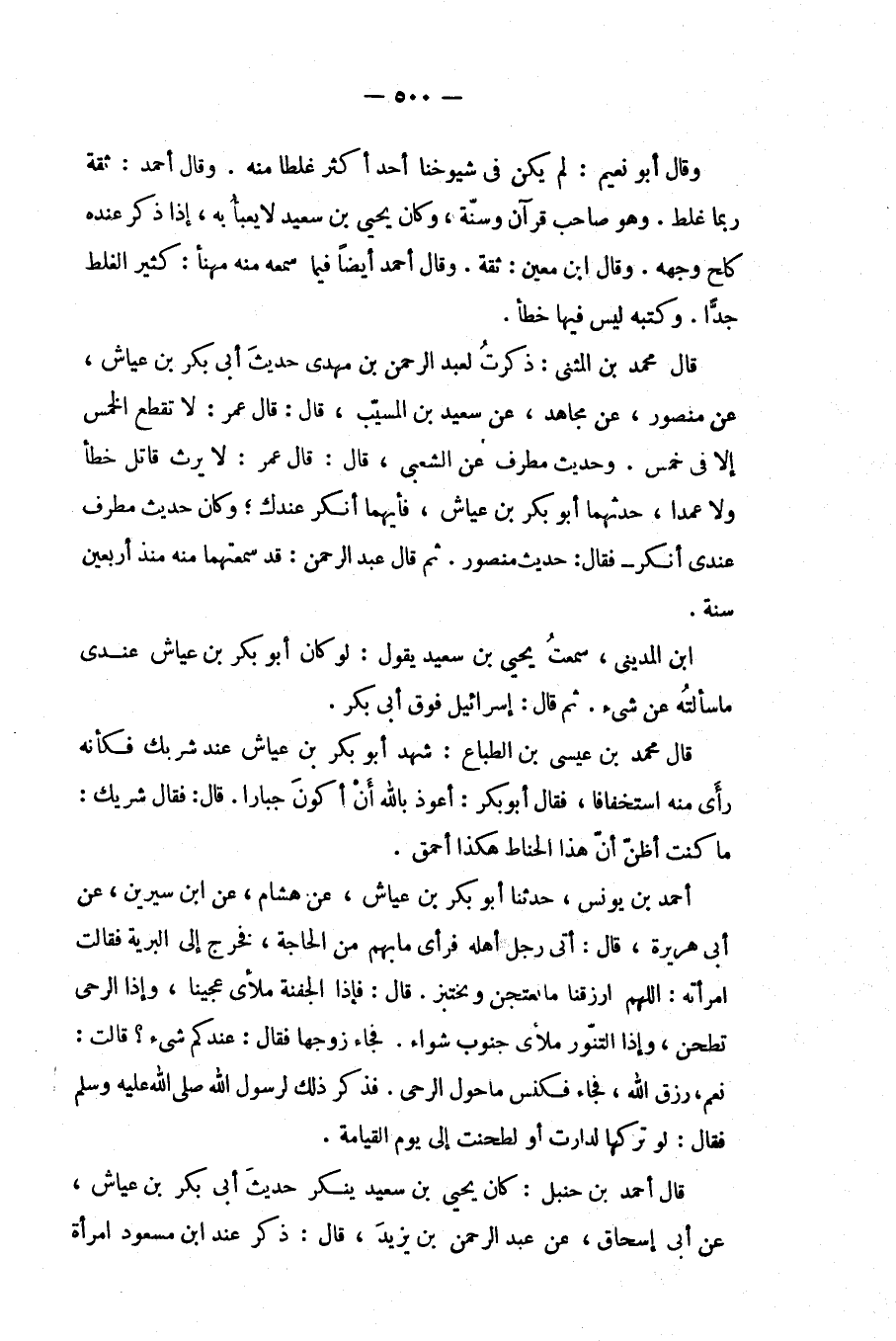 قال أحمد بن حنبل: كان يحيى بن سعيد ينكر حديث أبي بكر بن عياش، عن أبي إسحاق، عن عبد الرحمن بن يزيد، قال: ذكر عند ابن مسعود امرأة