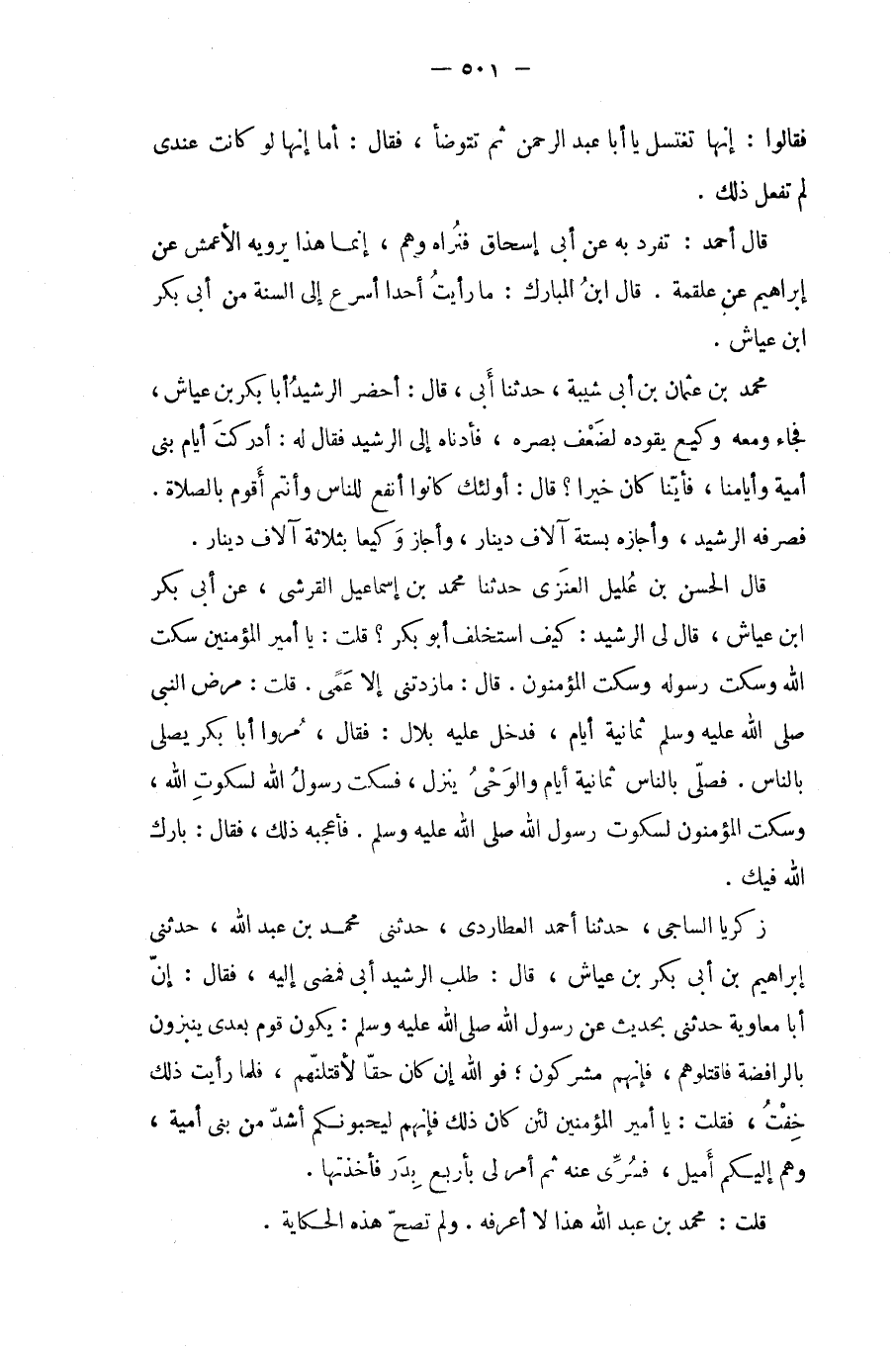 زكريا الساجي، حدثنا أحمد العطاردي، حدثني محمد بن عبد الله، حدثني إبراهيم بن أبي بكر بن عياش، قال: طلب الرشيد أبي فمضى إليه، فقال: إن أبا معاوية حدثني بحديث عن رسول الله صلى الله عليه وسلم: يكون قوم بعدى ينبزون بالرافضة فاقتلوهم، فإنهم مشركون، فو الله إن كان حقا لاقتلنهم، فلما رأيت ذلك خفت، فقلت: يا أمير المؤمنين لئن كان ذلك فإنهم ليحبونكم أشد من بنى أمية، وهم إليكم أميل، فسرى عنه ثم أمر لي بأربع بدر فأخذتها.