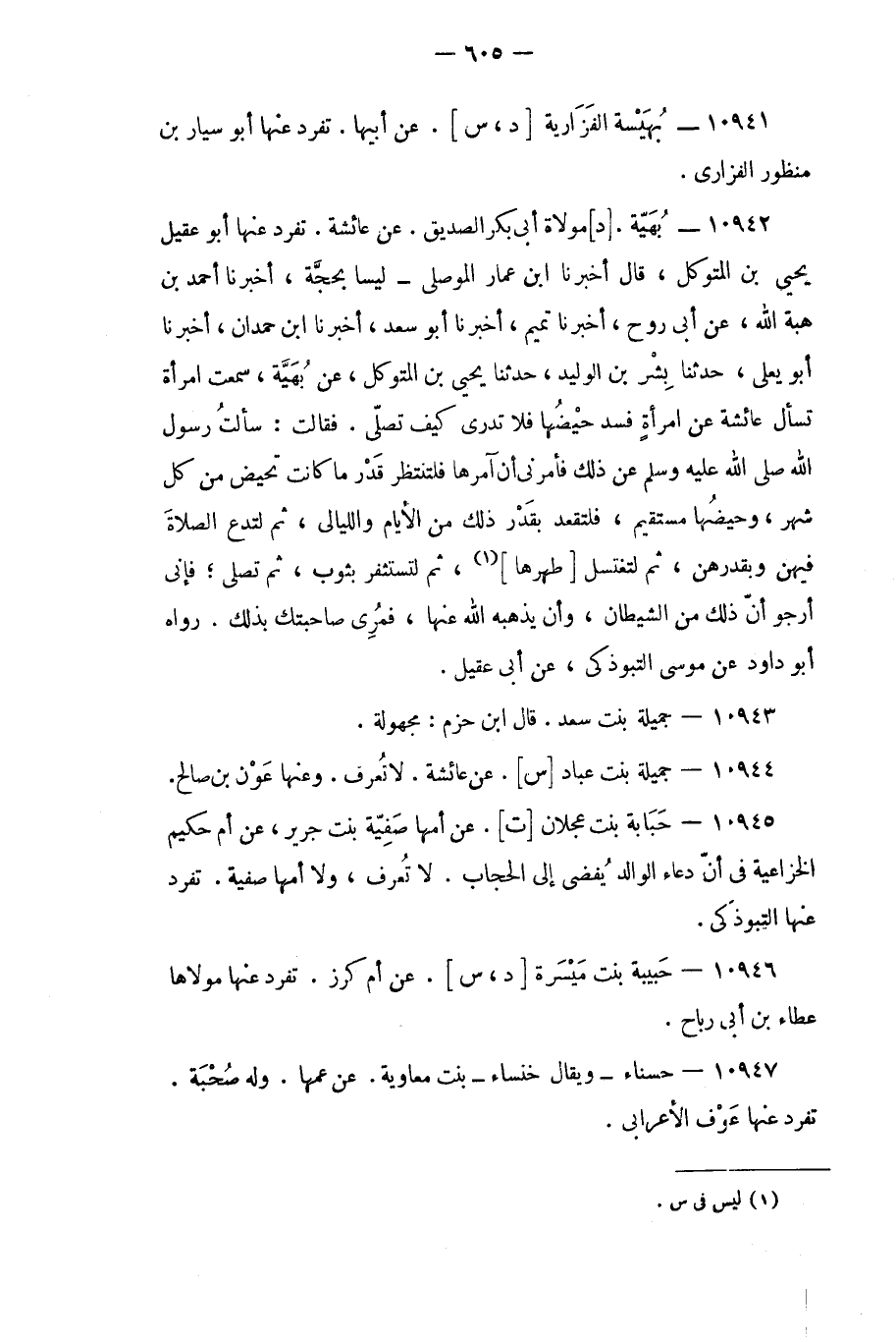 تفرد عنها أبو عقيل يحيى بن المتوكل، قال أخبرنا ابن عمار الموصلي - ليسا بحجة، أخبرنا أحمد بن هبة الله، عن أبي روح، أخبرنا تميم، أخبرنا أبو سعد، أخبرنا ابن حمدان، أخبرنا أبو يعلى، حدثنا بشر بن الوليد، حدثنا يحيى بن المتوكل، عن بهية، سمعت امرأة تسأل عائشة عن امرأة فسد حيضها فلا تدرى كيف تصلى.