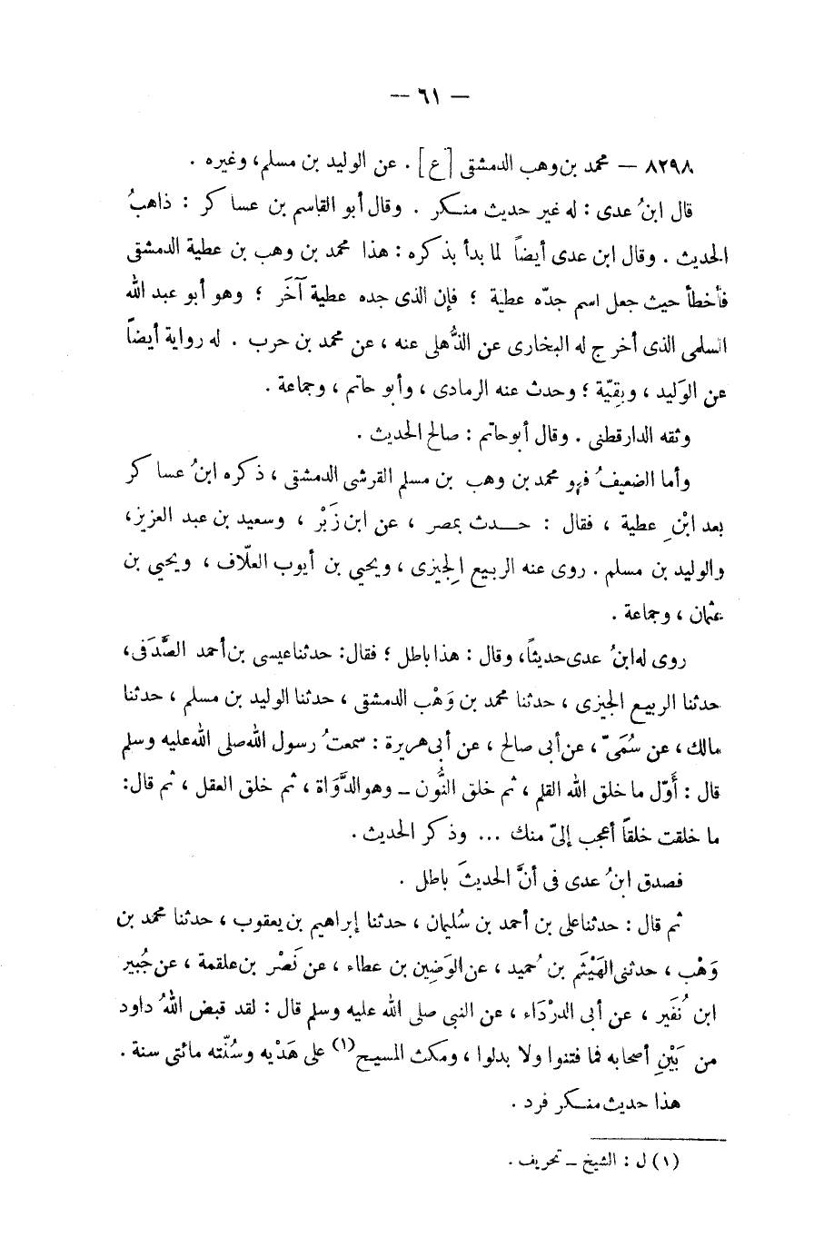 وأما الضعيف فهو محمد بن وهب بن مسلم القرشي الدمشقي، ذكره ابن عساكر بعد ابن عطية، فقال: حدث بمصر، عن ابن زبر، وسعيد بن عبد العزيز، والوليد بن مسلم.