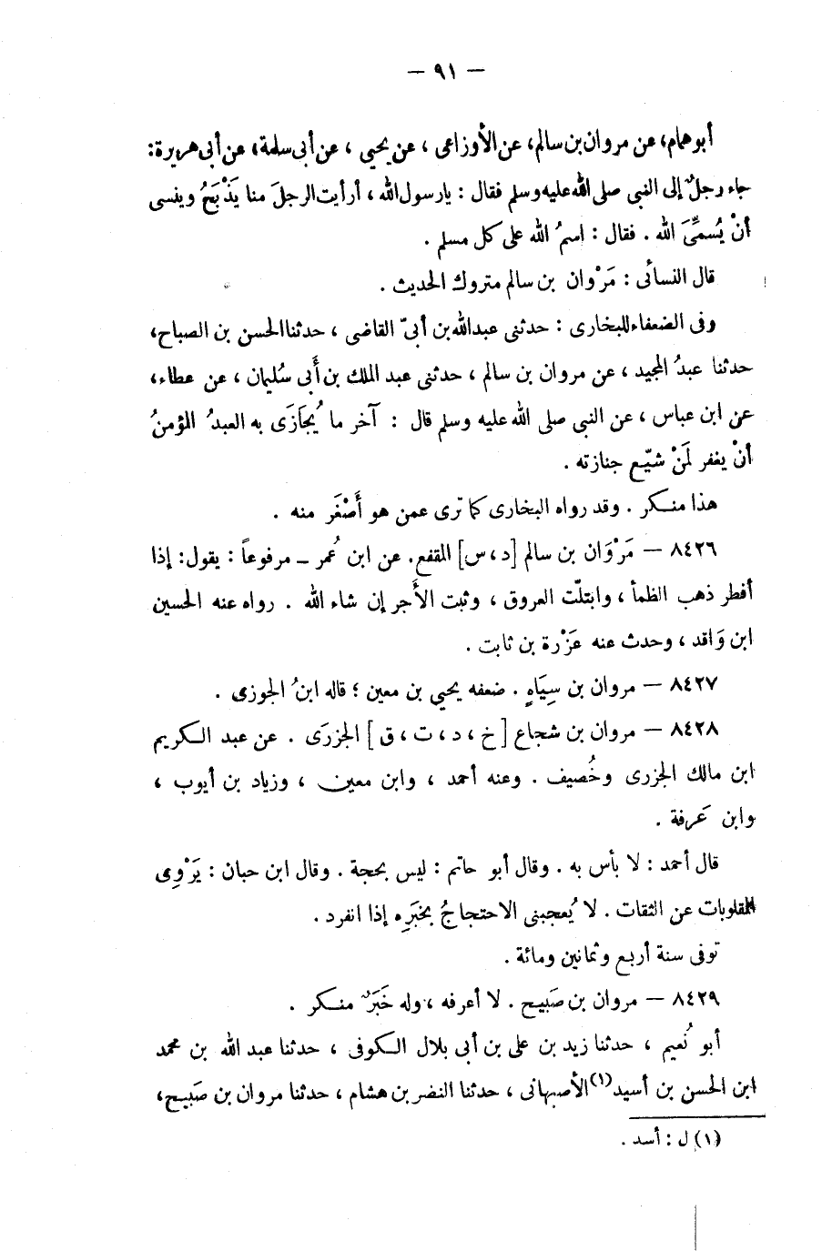 وفي الضعفاء للبخاري: حدثنى عبد الله بن أبي القاضي، حدثنا الحسن بن الصباح، حدثنا عبد المجيد، عن مروان بن سالم، حدثنى عبد الملك بن أبي سليمان، عن عطاء،