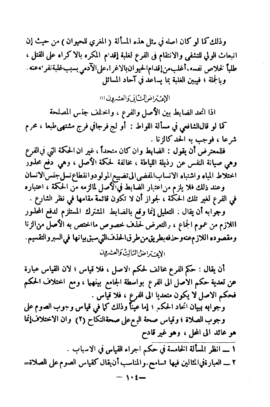 فَلِلْمُعْتَرِضِ أَنْ يَقُولَ: الضَّابِطُ وَإِنْ كَانَ مُتَّحِدًا، غَيْرَ أَنَّ الْحِكْمَةَ الَّتِي فِي الْفَرْعِ وَهِيَ صِيَانَةُ النَّفْسِ عَنْ رَذِيلَةِ اللِّيَاطَةِ مُخَالِفَةٌ لِحِكْمَةِ الْأَصْلِ، وَهِيَ دَفْعُ مَحْذُورِ اخْتِلَاطِ الْمِيَاهِ وَاشْتِبَاهِ الْأَنْسَابِ الْمُفْضِي إِلَى تَضْيِيعِ الْمَوْلُودِ وَانْقِطَاعِ نَسْلِ جِنْسِ الْإِنْسَانِ.