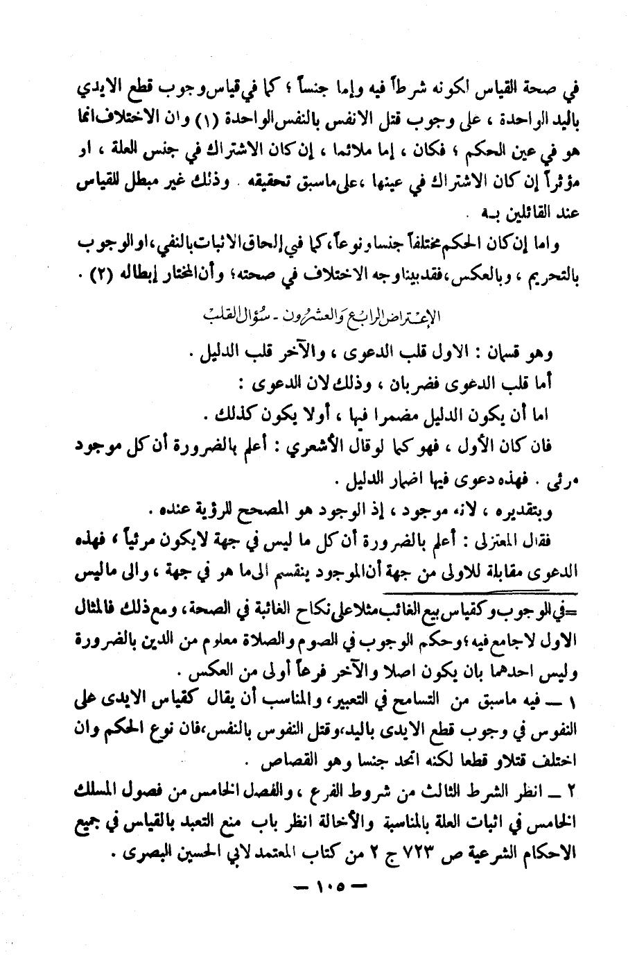 (٢) انْظُرِ الشَّرْطَ الثَّالِثَ مِنْ شُرُوطِ الْفَرْعِ، وَالْفَصْلَ الْخَامِسَ مِنْ فُصُولِ الْمَسْلَكِ الْخَامِسِ فِي إِثْبَاتِ الْعِلَّةِ بِالْمُنَاسَبَةِ وَالْإِخَالَةِ، انْظُرْ بَابَ مَنْعِ التَّعَبُّدِ بِالْقِيَاسِ فِي جَمِيعِ الْأَحْكَامِ الشَّرْعِيَّةِ ص ٧٢٣ ج٢ مِنْ كِتَابِ الْمُعْتَمَدِ لِأَبِي الْحُسَيْنِ الْبَصْرِيِّ.