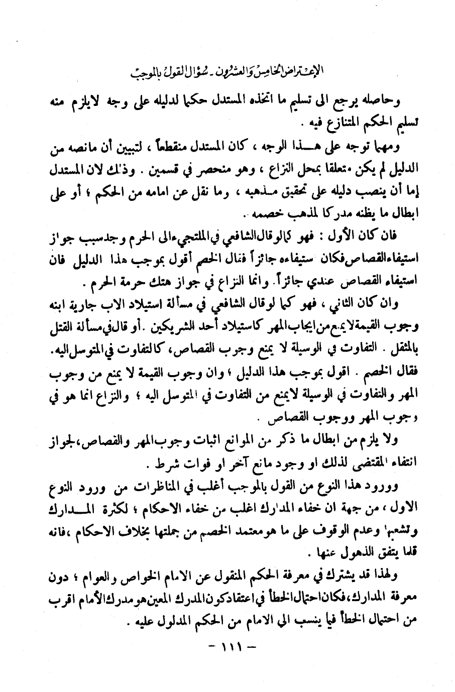 وَوُرُودُ هَذَا النَّوْعِ مِنَ الْقَوْلِ بِالْمُوجِبِ أَغْلَبُ فِي الْمُنَاظَرَاتِ مِنْ وُرُودِ النَّوْعِ الْأَوَّلِ مِنْ جِهَةِ أَنَّ خَفَاءَ الْمَدَارِكِ أَغْلَبُ مِنْ خَفَاءِ الْأَحْكَامِ؛ لِكَثْرَةِ الْمَدَارِكِ وَتَشَعُّبِهَا وَعَدَمِ الْوُقُوفِ عَلَى مَا هُوَ مُعْتَمَدُ الْخَصْمِ مِنْ جُمْلَتِهَا بِخِلَافِ الْأَحْكَامِ، فَإِنَّهُ قَلَّمَا يَتَّفِقُ الذُّهُولُ عَنْهَا.