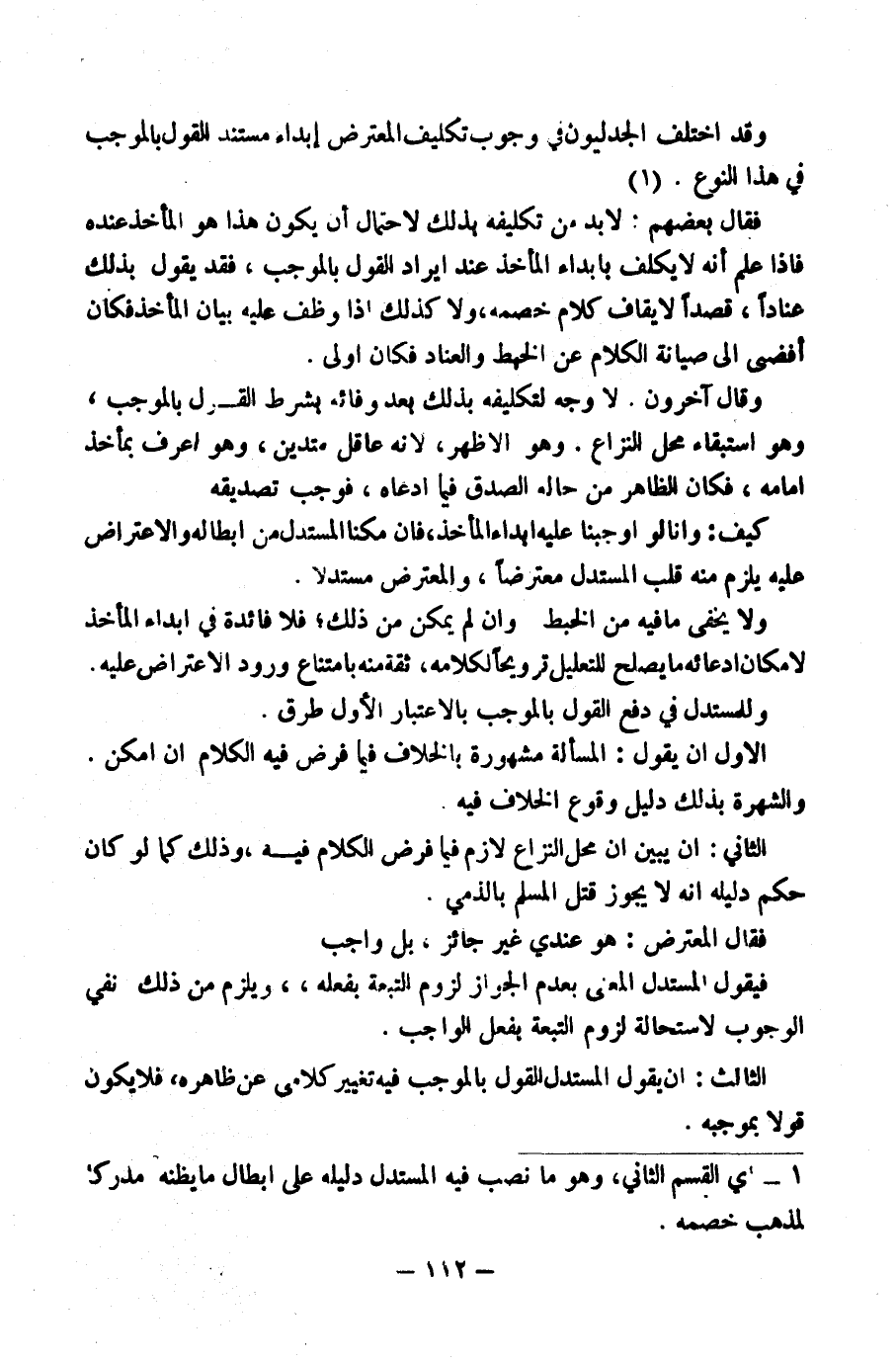 وَقَدِ اخْتَلَفَ الْجَدَلِيُّونَ فِي وُجُوبِ تَكْلِيفِ الْمُعْتَرِضِ إِبْدَاءَ مُسْتَنَدِ الْقَوْلِ بِالْمُوجِبِ فِي هَذَا النَّوْعِ (١) .