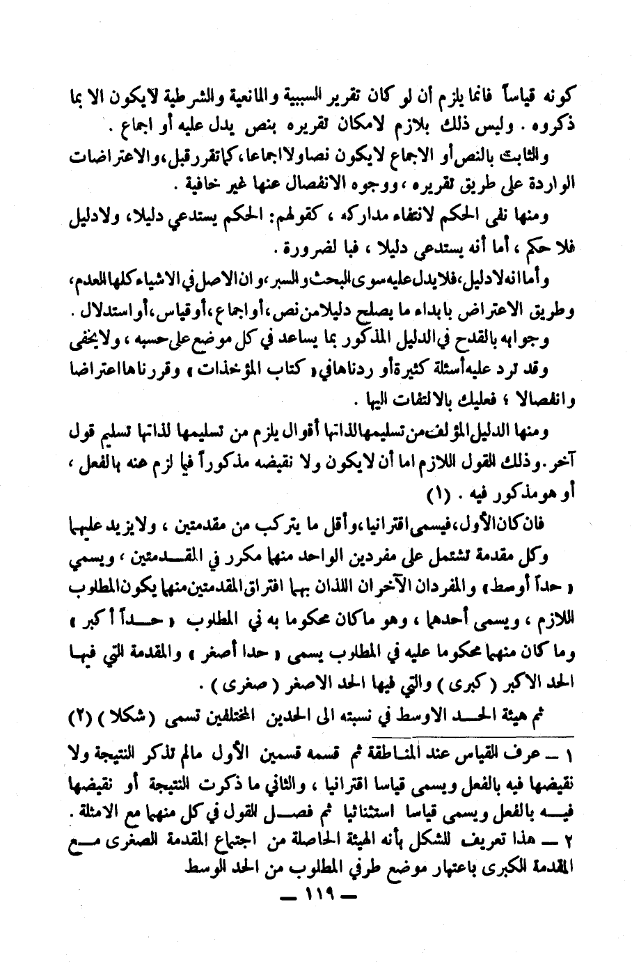 (١) عَرَّفَ الْقِيَاسَ عِنْدَ الْمَنَاطِقَةِ ثُمَّ قَسَمَهُ قِسْمَيْنِ: الْأَوَّلُ مَا لَمْ تُذْكَرِ النَّتِيجَةُ وَلَا نَقِيضُهَا فِيهِ بِالْفِعْلِ، وَيُسَمَّى قِيَاسًا اقْتِرَانِيًّا، وَالثَّانِي مَا ذُكِرَتِ النَّتِيجَةُ أَوْ نَقِيضُهَا فِيهِ بِالْفِعْلِ وَيُسَمَّى قِيَاسًا اسْتِثْنَائِيًّا، ثُمَّ فَصَّلَ الْقَوْلَ فِي كُلٍّ مِنْهُمَا مَعَ الْأَمْثِلَةِ.