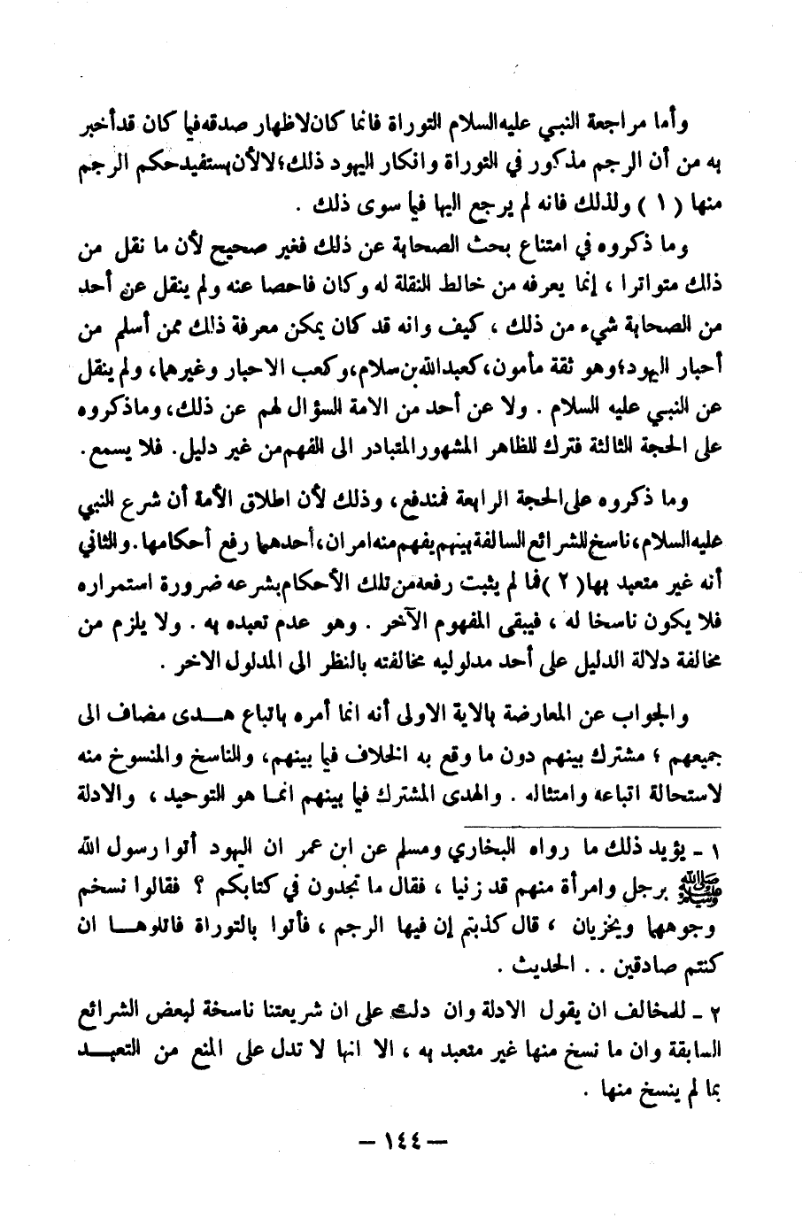 (١) يُؤَيِّدُ ذَلِكَ مَا رَوَاهُ الْبُخَارِيُّ وَمُسْلِمٌ عَنِ ابْنِ عُمَرَ أَنَّ الْيَهُودَ أَتَوْا رَسُولَ اللَّهِ صَلَّى اللَّهُ عَلَيْهِ وَسَلَّمَ بِرَجُلٍ وَامْرَأَةٍ مِنْهُمْ قَدْ زَنَيَا، فَقَالَ: مَا تَجِدُونَ فِي كِتَابِكُمْ؟ فَقَالُوا: نُسَخِّمُ وُجُوهَهُمَا وَيُخْزَيَانِ. قَالَ: كَذَبْتُمْ، إِنَّ فِيهَا آيَةَ الرَّجْمِ " فَأْتُوا بِالتَّوْرَاةِ فَاتْلُوهَا إِنْ كُنْتُمْ صَادِقِينَ. . " الْحَدِيثَ.