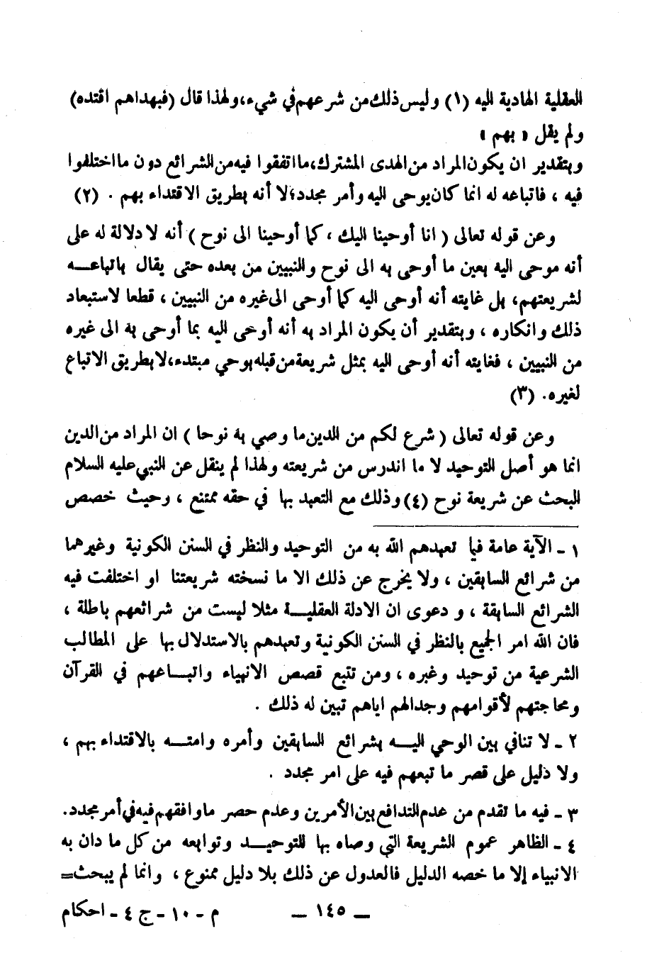 وَبِتَقْدِيرِ أَنْ يَكُونَ الْمُرَادُ مِنَ الْهُدَى الْمُشْتَرَكِ مَا اتَّفَقُوا فِيهِ مِنَ الشَّرَائِعِ دُونَ مَا اخْتَلَفُوا فِيهِ فَاتِّبَاعُهُ لَهُ إِنَّمَا كَانَ بِوَحْيٍ إِلَيْهِ وَأَمْرٍ مُجَدَّدٍ لَا أَنَّهُ بِطَرِيقِ الِاقْتِدَاءِ بِهِمْ. (٢) وَعَنْ قَوْلِهِ تَعَالَى: {إِنَّا أَوْحَيْنَا إِلَيْكَ كَمَا أَوْحَيْنَا إِلَى نُوحٍ} أَنَّهُ لَا دَلَالَةَ لَهُ عَلَى أَنَّهُ مُوحًى إِلَيْهِ بِعَيْنِ مَا أُوحِيَ بِهِ إِلَى نُوحٍ وَالنَّبِيِّينَ مِنْ بَعْدِهِ حَتَّى يُقَالَ بِاتِّبَاعِهِ لِشَرِيعَتِهِمْ، بَلْ غَايَتُهُ أَنَّهُ أَوْحَى إِلَيْهِ كَمَا أَوْحَى إِلَى غَيْرِهِ مِنَ النَّبِيِّينَ قَطْعًا لِاسْتِبْعَادِ ذَلِكَ وَإِنْكَارِهِ، وَبِتَقْدِيرِ أَنْ يَكُونَ الْمُرَادُ بِهِ أَنَّهُ أَوْحَى إِلَيْهِ بِمَا أَوْحَى بِهِ إِلَى غَيْرِهِ مِنَ النَّبِيِّينَ، فَغَايَتُهُ أَنَّهُ أَوْحَى إِلَيْهِ بِمِثْلِ شَرِيعَةِ مَنْ قَبْلَهُ بِوَحْيٍ مُبْتَدَإٍ لَا بِطْرِيقِ الِاتِّبَاعِ لِغَيْرِهِ. (٣) وَعَنْ قَوْلِهِ تَعَالَى: {شَرَعَ لَكُمْ مِنَ الدِّينِ مَا وَصَّى بِهِ نُوحًا} أَنَّ الْمُرَادَ مِنَ الدِّينِ إِنَّمَا هُوَ أَصْلُ التَّوْحِيدِ لَا مَا انْدَرَسَ مِنْ شَرِيعَتِهِ، وَلِهَذَا لَمْ يُنْقَلْ عَنِ النَّبِيِّ عَلَيْهِ السَّلَامُ الْبَحْثُ عَنْ شَرِيعَةِ نُوحٍ (٤) ، وَذَلِكَ مَعَ التَّعَبُّدِ بِهَا فِي حَقِّهِ مُمْتَنِعٌ، وَحَيْثُ خَصَّصَ