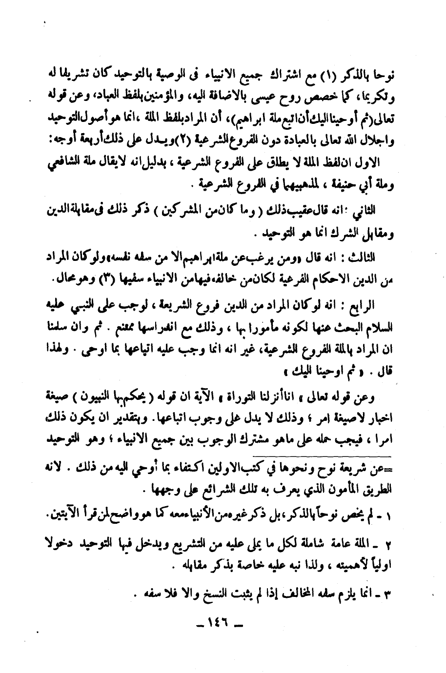 نُوحًا بِالذِّكْرِ (١) مَعَ اشْتِرَاكِ جَمِيعِ الْأَنْبِيَاءِ فِي الْوَصِيَّةِ بِالتَّوْحِيدِ كَانَ تَشْرِيفًا لَهُ وَتَكْرِيمًا، كَمَا خَصَّصَ رُوحَ عِيسَى بِالْإِضَافَةِ إِلَيْهِ وَالْمُؤْمِنِينَ بِلَفْظِ الْعِبَادِ. وَعَنْ قَوْلِهِ تَعَالَى: {ثُمَّ أَوْحَيْنَا إِلَيْكَ أَنِ اتَّبِعْ مِلَّةَ إِبْرَاهِيمَ} أَنَّ الْمُرَادَ بِلَفْظِ الْمِلَّةِ إِنَّمَا هُوَ أَصُولُ التَّوْحِيدِ وَإِجْلَالُ اللَّهِ تَعَالَى بِالْعِبَادَةِ دُونَ الْفُرُوعِ الشَّرْعِيَّةِ (٢) وَيَدُلُّ عَلَى ذَلِكَ أَرْبَعَةُ أَوْجُهٍ: