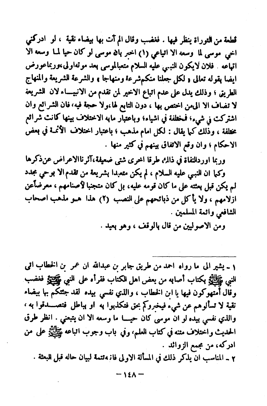 (١) يُشِيرُ إِلَى مَا رَوَاهُ أَحْمَدُ مِنْ طَرِيقِ جَابِرِ بْنِ عَبْدِ اللَّهِ أَنَّ عُمَرَ بْنَ الْخَطَّابِ أَتَى النَّبِيَّ صَلَّى اللَّهُ عَلَيْهِ وَسَلَّمَ بِكِتَابٍ أَصَابَهُ مِنْ بَعْضِ أَهْلِ الْكِتَابِ، فَقَرَأَهُ عَلَى النَّبِيِّ صَلَّى اللَّهُ عَلَيْهِ وَسَلَّمَ، فَغَضِبَ وَقَالَ: أَمُتَهَوِّكُونَ فِيهَا ابْنَ الْخَطَّابِ، وَالَّذِي نَفْسِي بِيَدِهِ لَقَدْ جِئْتُكُمْ بِهَا بَيْضَاءَ نَقِيَّةً لَا تَسْأَلُوهُمْ عَنْ شَيْءٍ، فَيُخْبِرُوكُمْ بِحَقٍّ فَتُكَذِّبُوا بِهِ أَوْ بِبَاطِلٍ فَتُصَدِّقُوا بِهِ، وَالَّذِي نَفْسِي بِيَدِهِ لَوْ أَنَّ مُوسَى كَانَ حَيًّا مَا وَسِعَهُ إِلَّا أَنْ يَتَّبِعَنِي ". انْظُرْ طُرُقَ الْحَدِيثِ وَاخْتِلَافَ مَتْنِهِ فِي كِتَابِ الْعِلْمِ، وَفِي بَابِ وُجُوبِ اتِّبَاعِهِ صَلَّى اللَّهُ عَلَيْهِ وَسَلَّمَ عَلَى مَنْ أَدْرَكَهُ مِنْ مَجْمَعِ الزَّوَائِدِ.