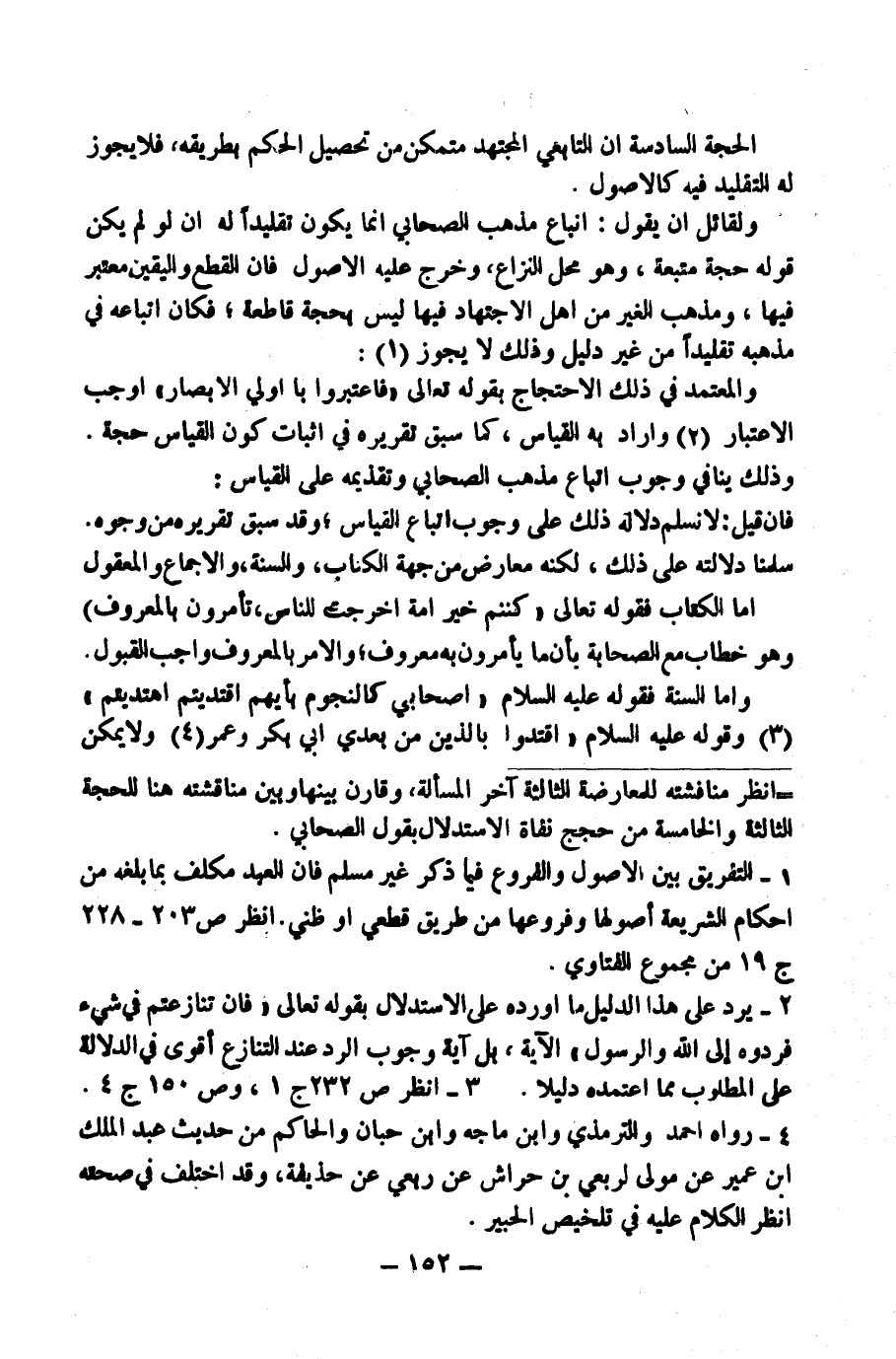 وَلِقَائِلٍ أَنْ يَقُولَ: اتِّبَاعُ مَذْهَبِ الصَّحَابِيِّ إِنَّمَا يَكُونُ تَقْلِيدًا لَهُ إِنْ لَوْ لَمْ يَكُنْ قَوْلُهُ حُجَّةً مُتَّبَعَةً، وَهُوَ مَحَلُّ النِّزَاعِ، وَخَرَجَ عَلَيْهِ الْأُصُولُ، فَإِنَّ الْقَطْعَ وَالْيَقِينَ مُعْتَبَرٌ فِيهَا، وَمَذْهَبُ الْغَيْرِ مِنْ أَهْلِ الِاجْتِهَادِ فِيهَا لَيْسَ بِحُجَّةٍ قَاطِعَةٍ، فَكَانَ اتِّبَاعُهُ فِي مَذْهَبِهِ تَقْلِيدًا مِنْ غَيْرِ دَلِيلٍ، وَذَلِكَ لَا يَجُوزُ. (١) وَالْمُعْتَمَدُ فِي ذَلِكَ الِاحْتِجَاجُ بِقَوْلِهِ تَعَالَى: {فَاعْتَبِرُوا يَا أُولِي الْأَبْصَارِ} أَوْجَبَ الِاعْتِبَارَ (٢) وَأَرَادَ بِهِ الْقِيَاسَ كَمَا سَبَقَ تَقْرِيرُهُ فِي إِثْبَاتِ كَوْنِ الْقِيَاسِ حُجَّةً، وَذَلِكَ يُنَافِي وُجُوبَ اتِّبَاعِ مَذْهَبِ الصَّحَابِيِّ وَتَقْدِيمَهُ عَلَى الْقِيَاسِ، فَإِنْ قِيلَ: لَا نُسَلِّمُ دَلَالَةَ ذَلِكَ عَلَى وُجُوبِ اتِّبَاعِ الْقِيَاسِ، وَقَدْ سَبَقَ تَقْرِيرُهُ مِنْ وُجُوهٍ، سَلَّمْنَا دَلَالَتَهُ عَلَى ذَلِكَ، لَكِنَّهُ مُعَارَضٌ مِنْ جِهَةِ الْكِتَابِ وَالسُّنَّةِ وَالْإِجْمَاعِ وَالْمَعْقُولِ.