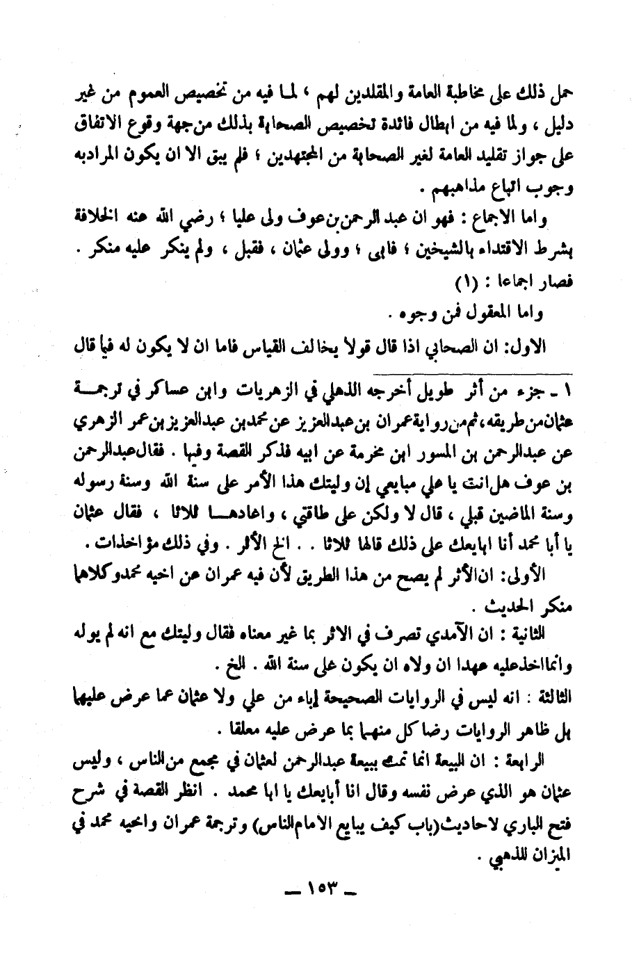 (١) جُزْءٌ مِنْ أَثَرٍ طَوِيلٍ أَخْرَجَهُ الذُّهْلِيُّ فِي الزُّهْرِيَّاتِ، وَابْنُ عَسَاكِرَ فِي تَرْجَمَةِ عُثْمَانَ مِنْ طَرِيقِهِ، ثُمَّ مِنْ رِوَايَةِ عِمْرَانَ بْنِ عَبْدِ الْعَزِيزِ عَنْ مُحَمَّدِ بْنِ عَبْدِ الْعَزِيزِ بْنِ عُمَرَ الزُّهْرِيِّ عَنْ عَبْدِ الرَّحْمَنِ بْنِ الْمِسْوَرِ بْنِ مَخْرَمَةَ عَنْ أَبِيهِ، فَذَكَرَ الْقِصَّةَ وَفِيهَا: فَقَالَ عَبْدُ الرَّحْمَنِ بْنُ عَوْفٍ: هَلْ أَنْتَ يَا عَلِيُّ مُبَايِعِي إِنْ وَلَّيْتُكَ هَذَا الْأَمْرَ عَلَى سُنَّةِ اللَّهِ وَسُنَّةِ رَسُولِهِ وَسُنَّةِ الْمَاضِينَ قَبْلِي؟ قَالَ: لَا وَلَكِنْ عَلَى طَاقَتِي، وَأَعَادَهَا ثَلَاثًا، فَقَالَ عُثْمَانُ: يَا أَبَا مُحَمَّدٍ أَنَا أُبَايِعُكَ عَلَى ذَلِكَ، قَالَهَا ثَلَاثًا. . . إِلَخِ الْأَثَرِ. وَفِي ذَلِكَ مُؤَاخَذَاتٌ: