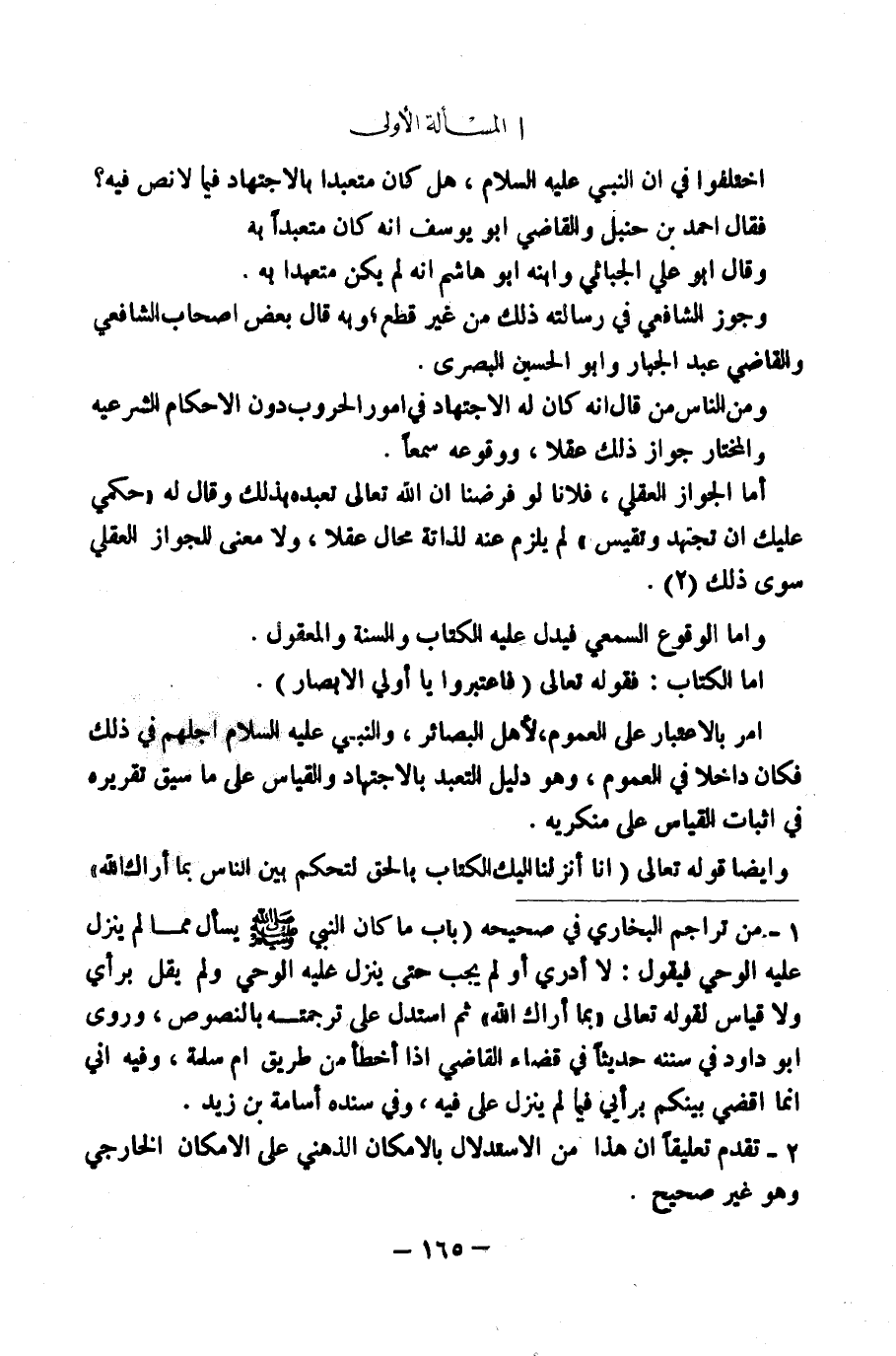 اخْتَلَفُوا فِي أَنَّ النَّبِيَّ عَلَيْهِ السَّلَامُ هَلْ كَانَ مُتَعَبَّدًا بِالِاجْتِهَادِ فِيمَا لَا نَصَّ فِيهِ؟ (١) فَقَالَ أَحْمَدُ بْنُ حَنْبَلٍ وَالْقَاضِي أَبُو يُوسُفَ: إِنَّهُ كَانَ مُتَعَبَّدًا بِهِ، وَقَالَ أَبُو عَلِيٍّ الْجُبَّائِيُّ وَابْنُهُ أَبُو هَاشِمٍ: إِنَّهُ لَمْ يَكُنْ مُتَعَبَّدًا بِهِ، وَجَوَّزَ الشَّافِعِيُّ فِي رِسَالَتِهِ ذَلِكَ مِنْ غَيْرِ قِطْعٍ، وَبِهِ قَالَ بَعْضُ أَصْحَابِ الشَّافِعِيِّ وَالْقَاضِي عَبْدِ الْجَبَّارِ وَأَبُو الْحُسَيْنِ الْبَصْرِيُّ.