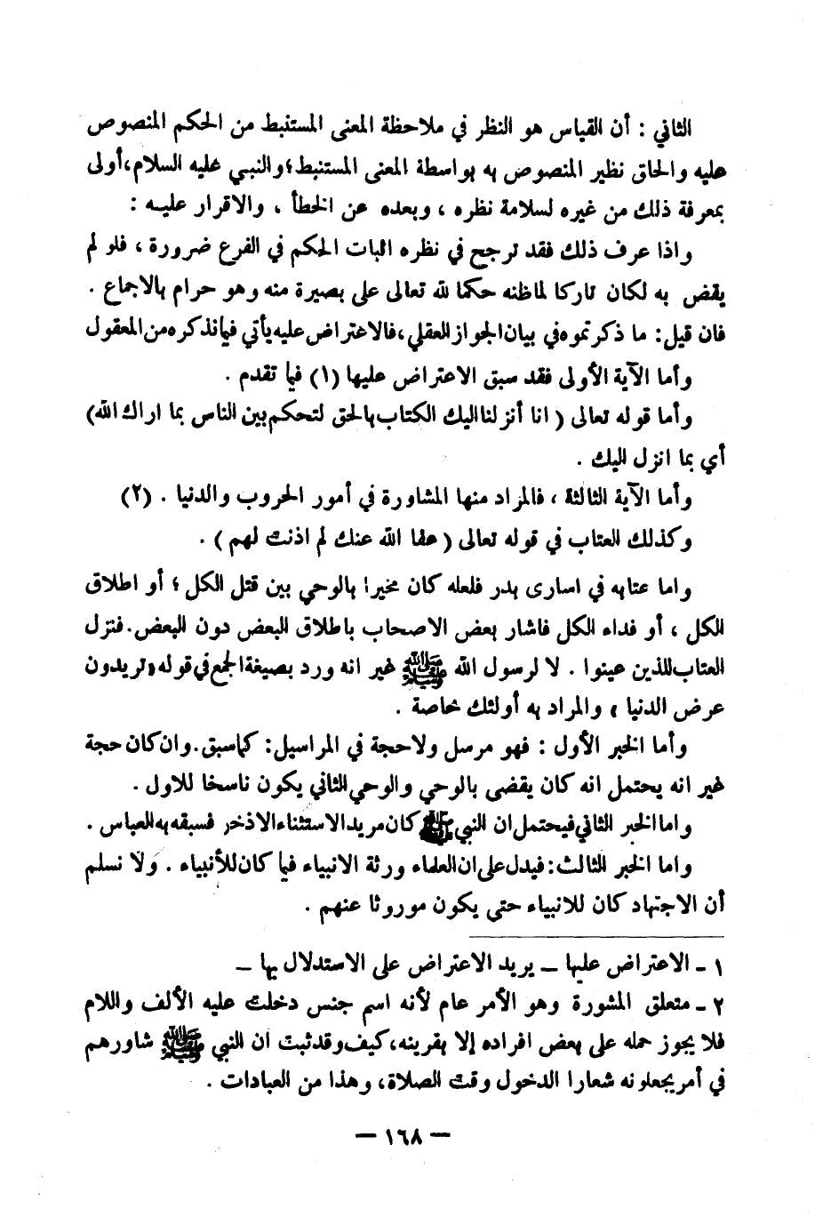 الثَّانِي: أَنَّ الْقِيَاسَ هُوَ النَّظَرُ فِي مُلَاحَظَةِ الْمَعْنَى الْمُسْتَنْبَطِ مِنَ الْحُكْمِ الْمَنْصُوصِ عَلَيْهِ، وَإِلْحَاقِ نَظِيرِ الْمَنْصُوصِ بِهِ بِوَاسِطَةِ الْمَعْنَى الْمُسْتَنْبَطِ، وَالنَّبِيُّ عَلَيْهِ السَّلَامُ أَوْلَى بِمَعْرِفَةِ ذَلِكَ مِنْ غَيْرِهِ لِسَلَامَةِ نَظَرِهِ وَبُعْدِهِ عَنِ الْخَطَإِ وَالْإِقْرَارِ عَلَيْهِ.