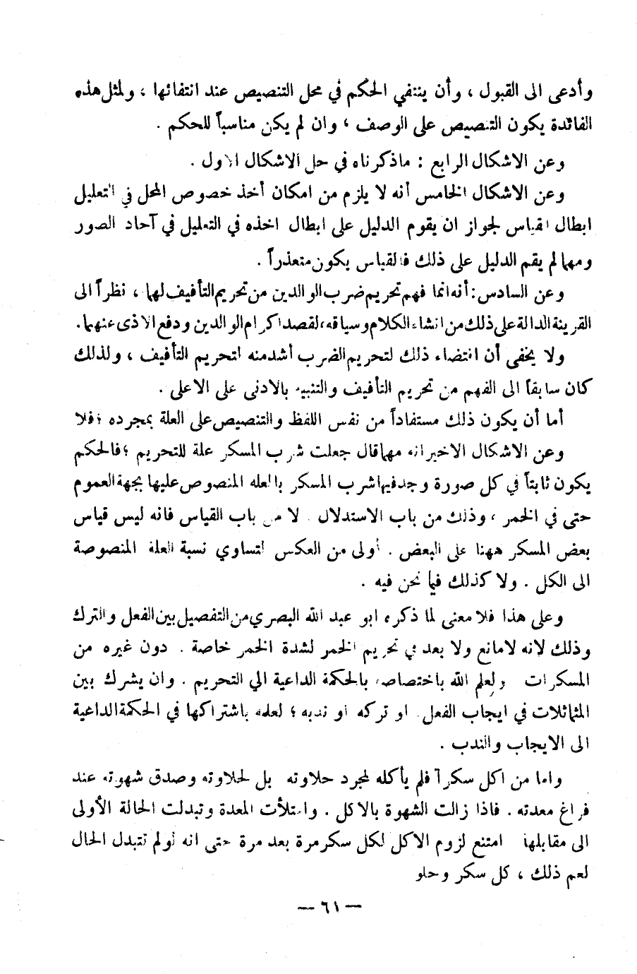 وَعَلَى هَذَا فَلَا مَعْنَى لِمَا ذَكَرَهُ أَبُو عَبْدِ اللَّهِ الْبَصْرِيُّ مِنَ التَّفْصِيلِ بَيْنَ الْفِعْلِ وَالتَّرْكِ، وَذَلِكَ لِأَنَّهُ لَا مَانِعَ وَلَا بُعْدَ فِي تَحْرِيمِ الْخَمْرِ لِشِدَّةِ الْخَمْرِ خَاصَّةً دُونَ غَيْرِهِ مِنَ الْمُسْكِرَاتِ، وَلِعِلْمِ اللَّهِ بِاخْتِصَاصِهِ بِالْحِكْمَةِ الدَّاعِيَةِ إِلَى التَّحْرِيمِ وَأَنْ يَشْرِكَ بَيْنَ الْمُتَمَاثِلَاتِ فِي إِيجَابِ الْفِعْلِ أَوْ تَرْكِهِ أَوْ نَدْبِهِ لِعِلْمِهِ بِاشْتِرَاكِهَا فِي الْحِكْمَةِ الدَّاعِيَةِ إِلَى الْإِيجَابِ وَالنَّدْبِ.