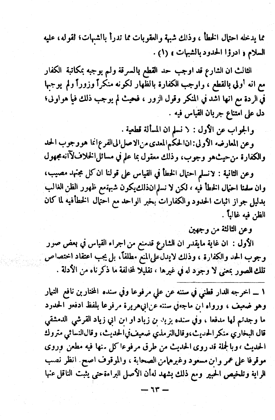 (١) أَخْرَجَهُ الدَّارَقُطْنِيُّ فِي سُنَنِهِ عَنْ عَلِيٍّ مَرْفُوعًا وَفِي سَنَدِهِ الْمُخْتَارُ بْنُ نَافِعٍ التَّمَّارُ وَهُوَ ضَعِيفٌ، وَرَوَاهُ ابْنُ مَاجَهْ فِي سُنَنِهِ عَنْ أَبِي هُرَيْرَةَ مَرْفُوعًا بِلَفْظِ: ادْفَعُوا الْحُدُودَ مَا وَجَدْتُمْ لَهَا مَدْفَعًا، وَفِي سَنَدِهِ يَزِيدُ بْنُ زِيَادٍ أَوِ ابْنُ أَبِي زِيَادٍ الْقُرَشِيُّ الدِّمَشْقِيُّ قَالَ الْبُخَارِيُّ: مُنْكَرُ الْحَدِيثِ وَقَالَ التِّرْمِذِيُّ: ضَعِيفٌ فِي الْحَدِيثِ، وَقَالَ النَّسَائِيُّ مَتْرُوكُ الْحَدِيثِ، وَبِالْجُمْلَةِ قَدْ رُوِيَ الْحَدِيثُ مِنْ طُرُقٍ مَرْفُوعًا كُلٌّ مِنْهَا فِيهِ مَطْعَنٌ وَرُوِيَ مَوْقُوفًا عَلَى عُمَرَ وَابْنِ مَسْعُودٍ وَغَيْرِهِمَا مِنَ الصَّحَابَةِ، وَالْمَوْقُوفُ أَصَحُّ انْظُرْ نَصْبَ الرَّايَةِ وَتَلْخِيصَ الْحَبِيرِ وَمَعَ ذَلِكَ يَشْهَدُ لَهُ أَنَّ الْأَصْلَ الْبَرَاءَةُ حَتَّى يَثْبُتَ النَّاقِلُ عَنْهَا.