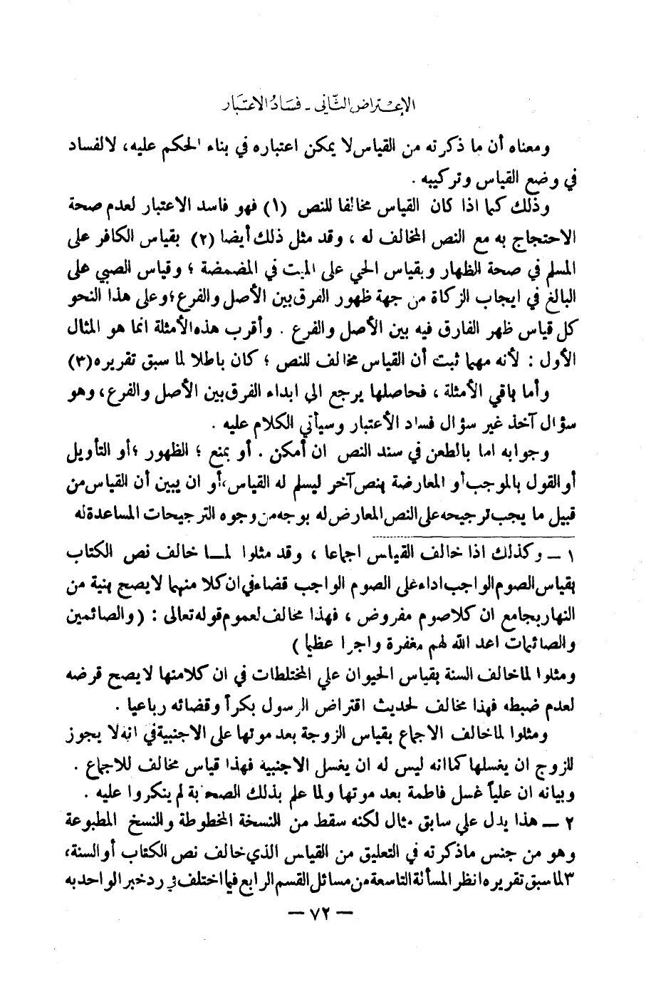 (٢) هَذَا يَدُلُّ عَلَى سَابِقِ مِثَالٍ لَكِنَّهُ سَقَطَ مِنَ النُّسْخَةِ الْمَخْطُوطَةِ وَالنُّسَخِ الْمَطْبُوعَةِ وَهُوَ مِنْ جِنْسِ مَا ذَكَرْتُهُ فِي التَّعْلِيقِ مِنَ الْقِيَاسِ الَّذِي خَالَفَ نَصَّ الْكِتَابِ أَوِ السُّنَّةِ.