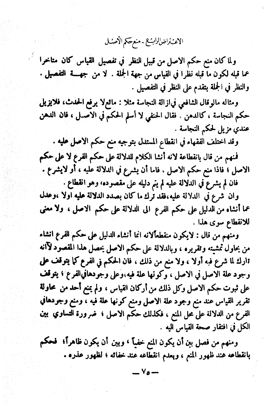 وَمِنْهُمْ مَنْ قَالَ: لَا يَكُونُ مُنْقَطِعًا لِأَنَّهُ إِنَّمَا أَنْشَأَ الدَّلِيلَ عَلَى حُكْمِ الْفَرْعِ إِنْشَاءَ مَنْ يُحَاوِلُ تَمْشِيَتَهُ وَتَقْرِيرَهُ، وَبِالدَّلَالَةِ عَلَى حُكْمِ الْأَصْلِ يَحْصُلُ هَذَا الْمَقْصُودُ لَا أَنَّهُ تَارِكٌ لِمَا شَرَعَ فِيهِ أَوَّلًا وَلَا مَنْعَ مِنْ ذَلِكَ، فَإِنَّ الْحُكْمَ فِي الْفَرْعِ كَمَا يَتَوَقَّفُ عَلَى وُجُودِ عِلَّةِ الْأَصْلِ فِي الْأَصْلِ وَكَوْنِهَا عِلَّةً فِيهِ، وَعَلَى وُجُودِهَا فِي الْفَرْعِ يَتَوَقَّفُ عَلَى ثُبُوتِ حُكْمِ الْأَصْلِ، وَكُلُّ ذَلِكَ مِنْ أَرْكَانِ الْقِيَاسِ، وَلَمْ يُمْنَعْ أَحَدٌ مِنْ مُحَاوَلَةِ تَقْرِيرِ الْقِيَاسِ عِنْدَ مَنْعِ وُجُودِ عِلَّةِ الْأَصْلِ وَمَنْعِ كَوْنِهَا عِلَّةً فِيهِ، وَمَنْعِ وَجُودِهَا فِي الْفَرْعِ مِنَ الدَّلَالَةِ عَلَى مَحَلِّ الْمَنْعِ، فَكَذَلِكَ حُكْمُ الْأَصْلِ ضَرُورَةَ التَّسَاوِي بَيْنَ الْكُلِّ فِي افْتِقَارِ صِحَّةِ الْقِيَاسِ إِلَيْهِ.