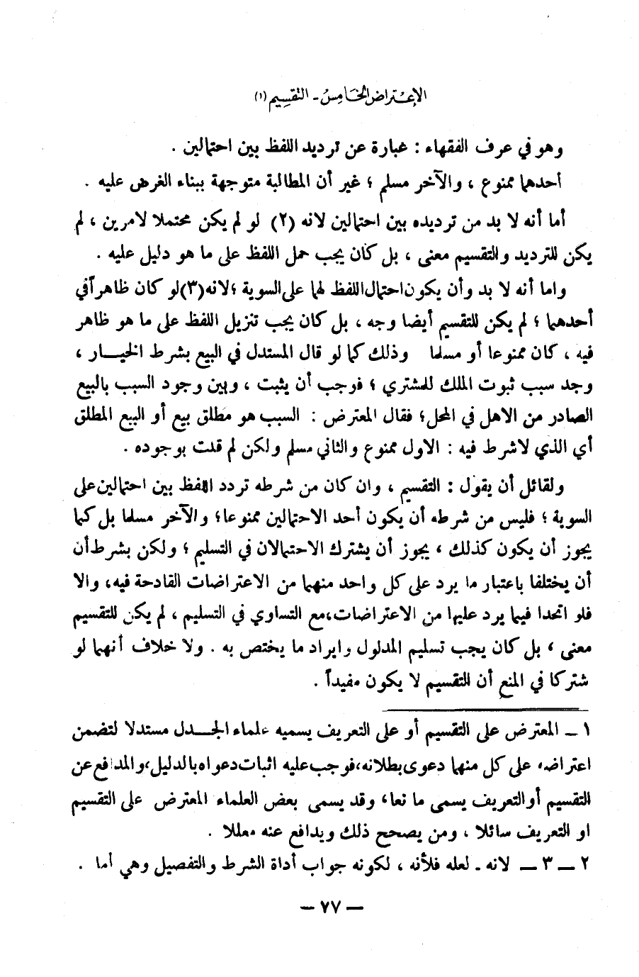 وَلِقَائِلٍ أَنْ يَقُولَ: التَّقْسِيمُ وَإِنْ كَانَ مِنْ شَرْطِهِ تَرَدُّدُ اللَّفْظِ بَيْنَ احْتِمَالَيْنِ عَلَى السَّوِيَّةِ، فَلَيْسَ مِنْ شَرْطِهِ أَنْ يَكُونَ أَحَدُ الِاحْتِمَالَيْنِ مَمْنُوعًا وَالْآخَرُ مُسَلَّمًا، بَلْ كَمَا يَجُوزُ أَنْ يَكُونَ كَذَلِكَ يَجُوزُ أَنْ يَشْتَرِكَ الِاحْتِمَالَانِ فِي التَّسْلِيمِ وَلَكِنْ بِشَرْطِ أَنْ يَخْتَلِفَا بِاعْتِبَارِ مَا يَرِدُ عَلَى كُلِّ وَاحِدٍ مِنْهُمَا مِنَ الِاعْتِرَاضَاتِ الْقَادِحَةِ فِيهِ، وَإِلَّا فَلَوِ اتَّحَدَا فِيمَا يَرِدُ عَلَيْهِمَا مِنَ الِاعْتِرَاضَاتِ مَعَ التَّسَاوِي فِي التَّسْلِيمِ لَمْ يَكُنْ لِلتَّقْسِيمِ مَعْنًى، بَلْ كَانَ يَجِبُ تَسْلِيمُ الْمَدْلُولِ وَإِيرَادُ مَا يَخْتَصُّ بِهِ.