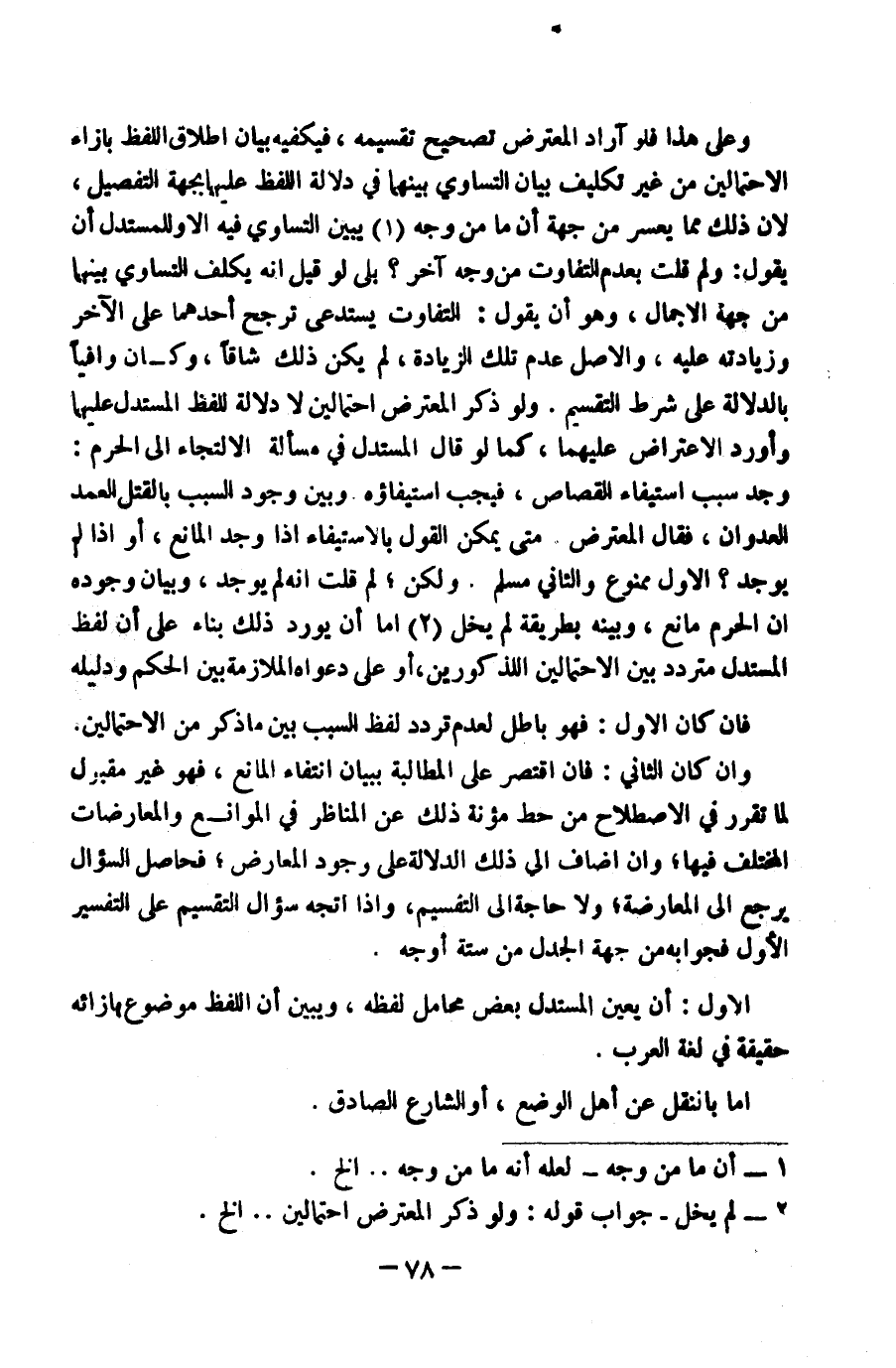 وَلَوْ ذَكَرَ الْمُعْتَرِضُ احْتِمَالَيْنِ لَا دَلَالَةَ لِلَّفْظِ الْمُسْتَدَلِّ عَلَيْهِمَا وَأَوْرَدَ الِاعْتِرَاضَ عَلَيْهِمَا كَمَا لَوْ قَالَ الْمُسْتَدِلُّ فِي مَسْأَلَةِ الِالْتِجَاءِ إِلَى الْحَرَمِ: وُجِدَ سَبَبُ اسْتِيفَاءِ الْقِصَاصِ، فَيَجِبُ اسْتِيفَاؤُهُ وَبَيَّنَ وُجُودَ السَّبَبِ بِالْقَتْلِ الْعَمْدِ الْعُدْوَانِ، فَقَالَ الْمُعْتَرِضُ: مَتَى يُمْكِنُ الْقَوْلُ بِالِاسْتِيفَاءِ؟ إِذَا وُجِدَ الْمَانِعُ أَوْ إِذَا لَمْ يُوجَدْ؟ الْأَوَّلُ مَمْنُوعٌ وَالثَّانِي مُسَلَّمٌ.