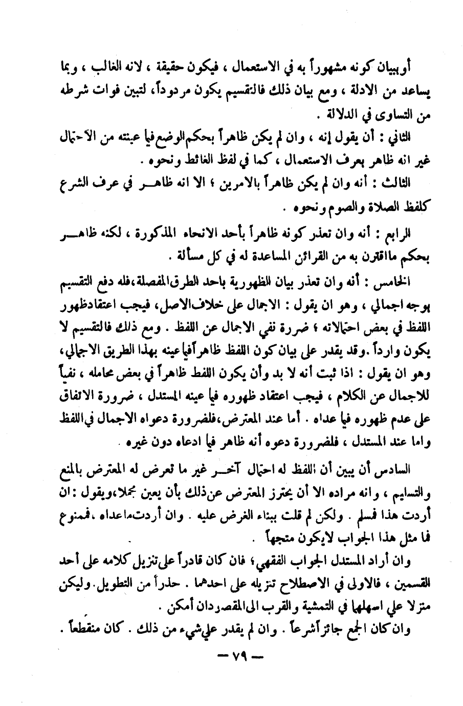 الْخَامِسُ: أَنَّهُ وَإِنْ تَعَذَّرَ بَيَانُ الظُّهُورِيَّةِ بِأَحَدِ الطُّرُقِ الْمُفَصَّلَةِ، فَلَهُ دَفْعُ التَّقْسِيمِ بِوَجْهٍ إِجْمَالِيٍّ، وَهُوَ أَنْ يَقُولَ: الْإِجْمَالُ عَلَى خِلَافِ الْأَصْلِ، فَيَجِبُ اعْتِقَادُ ظُهُورِ اللَّفْظِ فِي بَعْضِ احْتِمَالَاتِهِ؛ ضَرُورَةَ نَفْيِ الْإِجْمَالِ عَنِ اللَّفْظِ، وَمَعَ ذَلِكَ فَالتَّقْسِيمُ لَا يَكُونُ وَارِدًا.