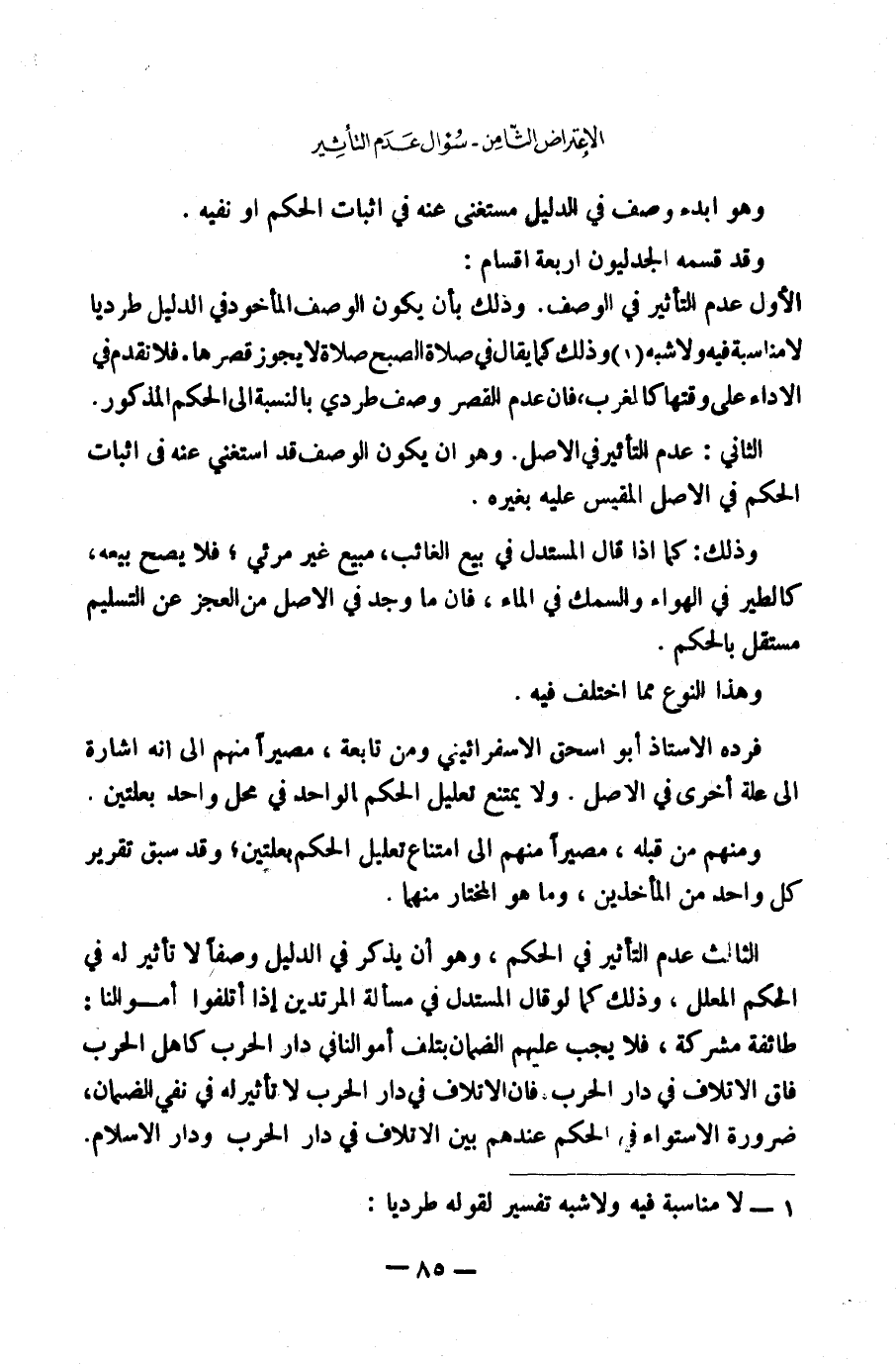 الْأَوَّلُ: عَدَمُ التَّأْثِيرِ فِي الْوَصْفِ، وَذَلِكَ بِأَنْ يَكُونَ الْوَصْفُ الْمَأْخُوذُ فِي الدَّلِيلِ طَرْدِيًّا لَا مُنَاسَبَةَ فِيهِ وَلَا شَبَهَ، (١) وَذَلِكَ كَمَا يُقَالُ فِي صَلَاةِ الصُّبْحِ: صَلَاةٌ لَا يَجُوزُ قَصْرُهَا، فَلَا تُقَدَّمَ فِي الْأَدَاءِ عَلَى وَقْتِهَا كَالْمَغْرِبِ فَإِنَّ عَدَمَ الْقَصْرِ وَصْفٌ طَرْدِيٌّ بِالنِّسْبَةِ إِلَى الْحُكْمِ الْمَذْكُورِ.
